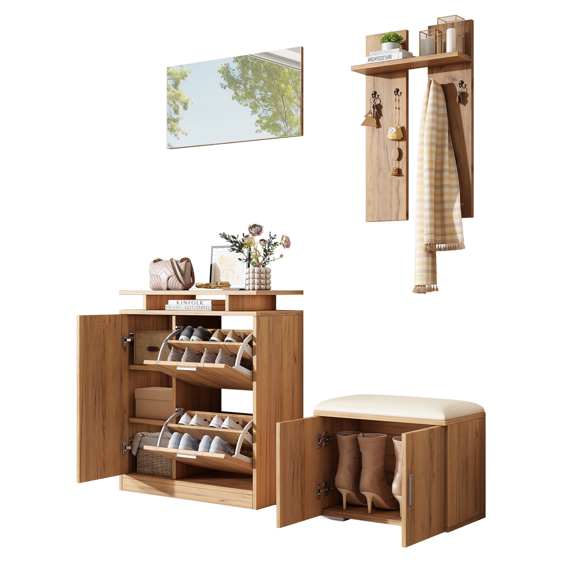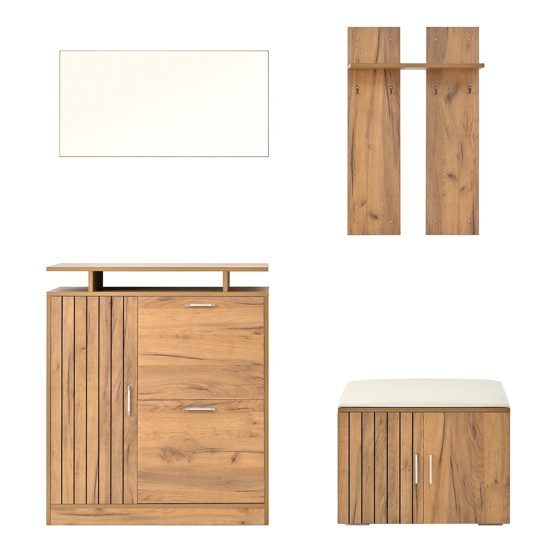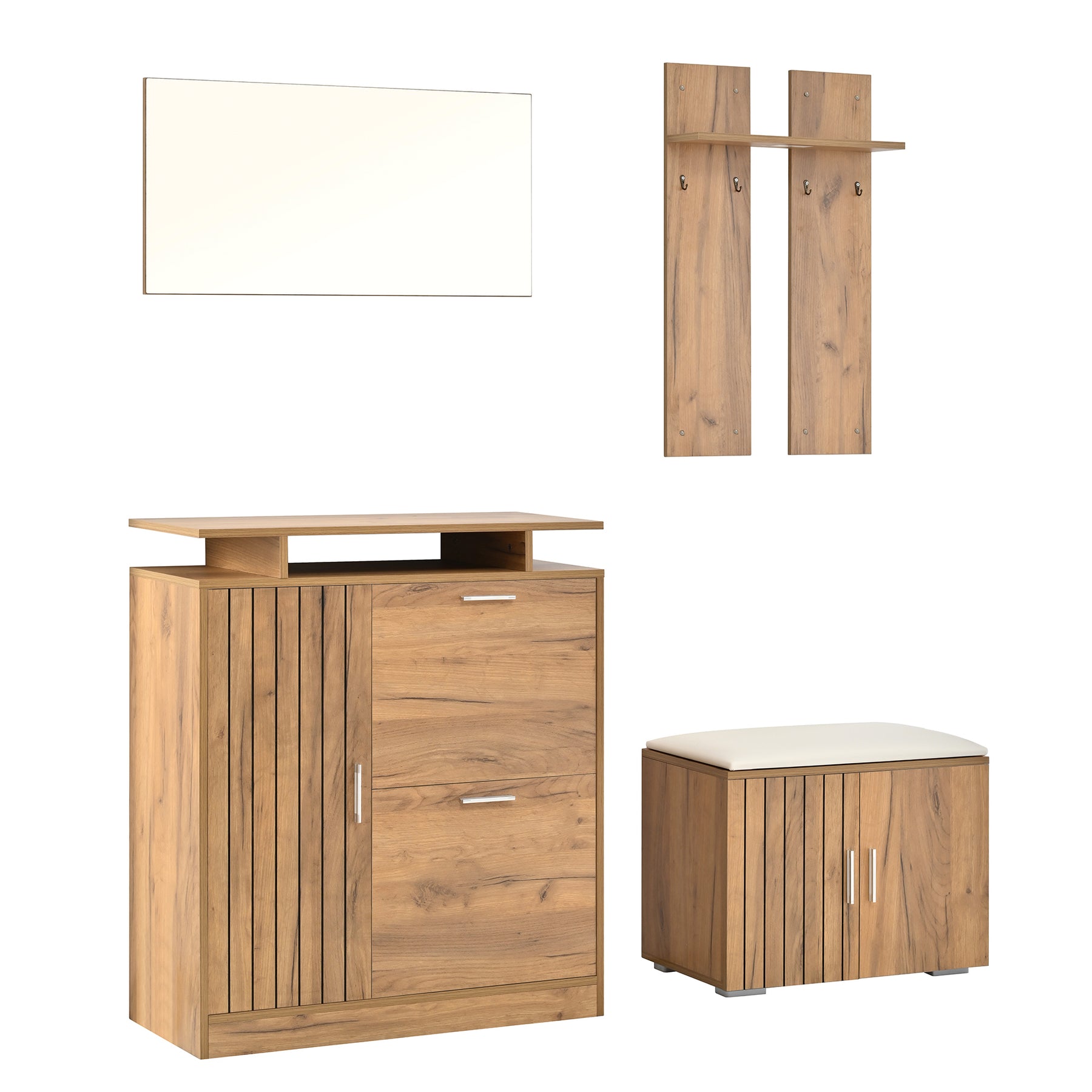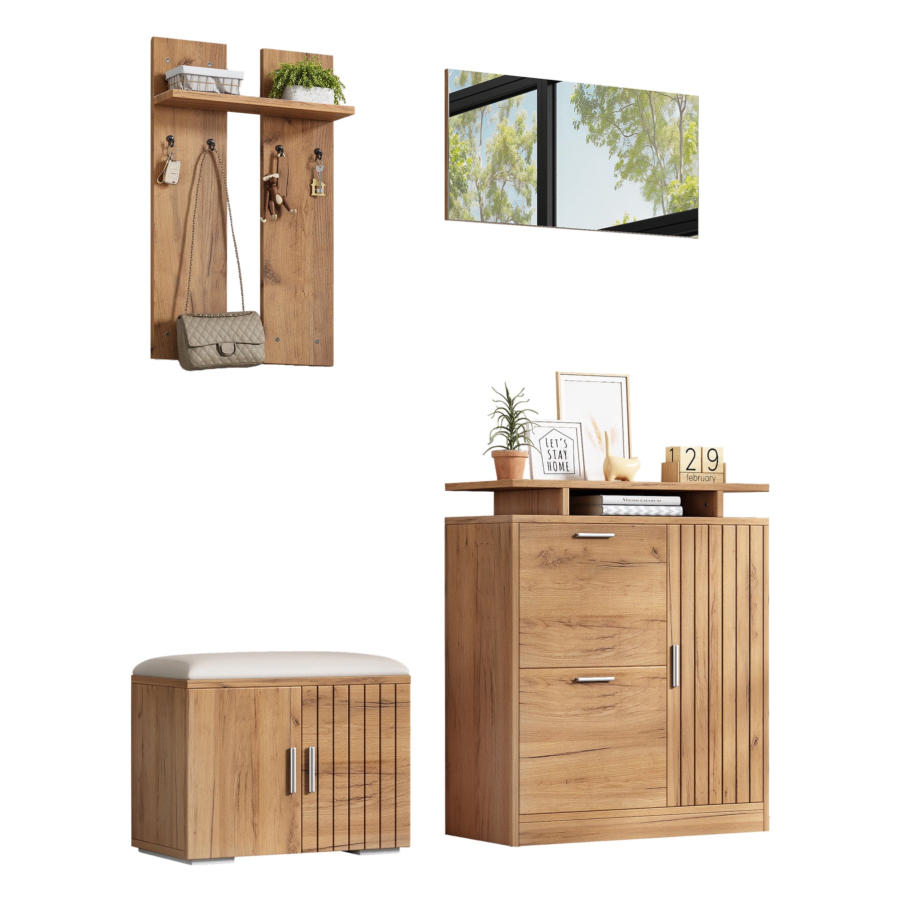 Imaginez rentrer chez vous après une longue journée et être accueilli par un espace d'entrée parfaitement organisé et élégant. Ce set de meubles d'entrée multifonctionnel transforme votre hall en un lieu chaleureux et ordonné, où chaque objet trouve sa place. Grâce à son design moderne en bois naturel, il s'intègre harmonieusement à tous les styles d'intérieur, tout en offrant une solution pratique pour le rangement des chaussures, manteaux et accessoires.