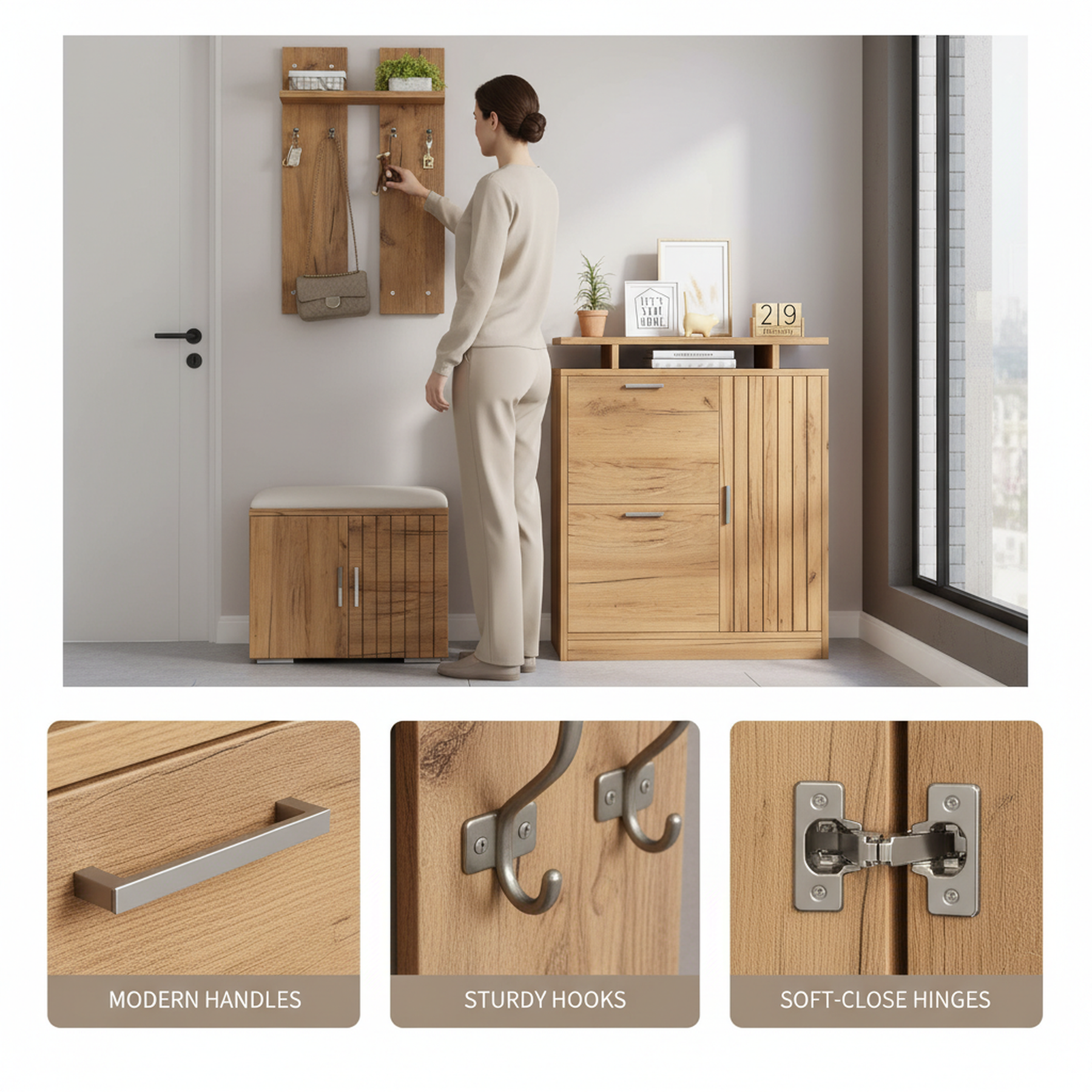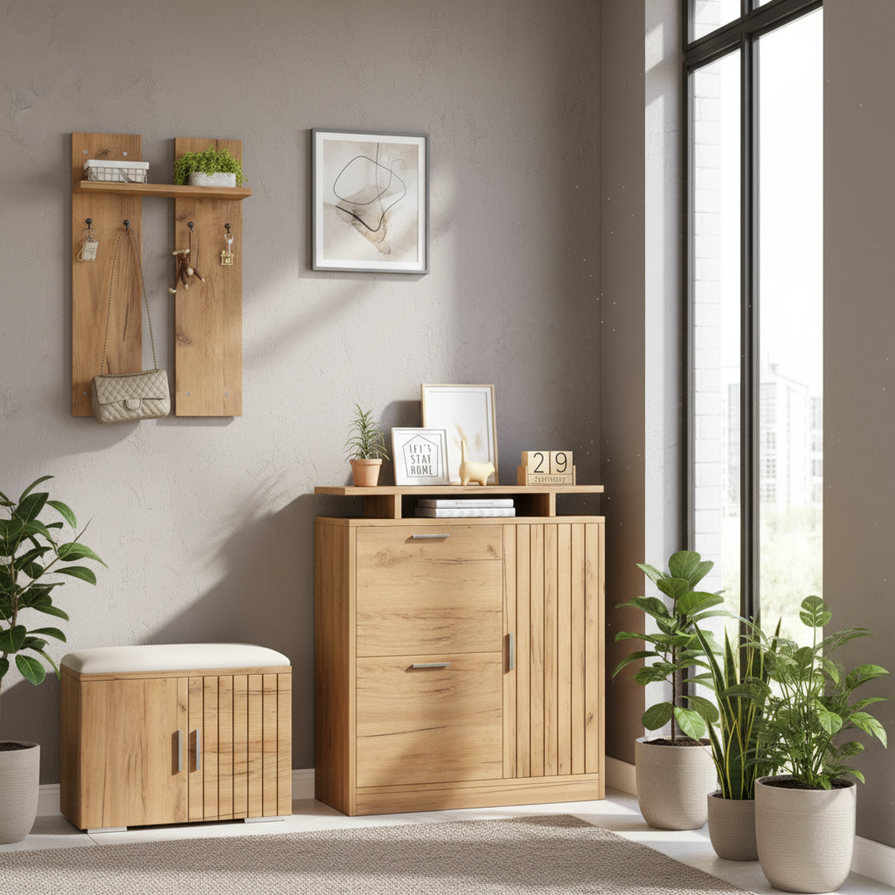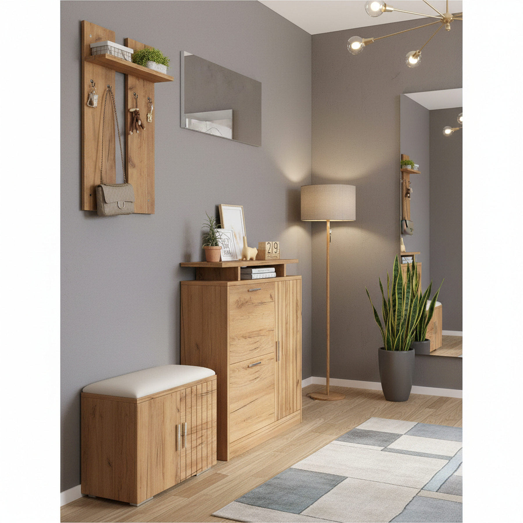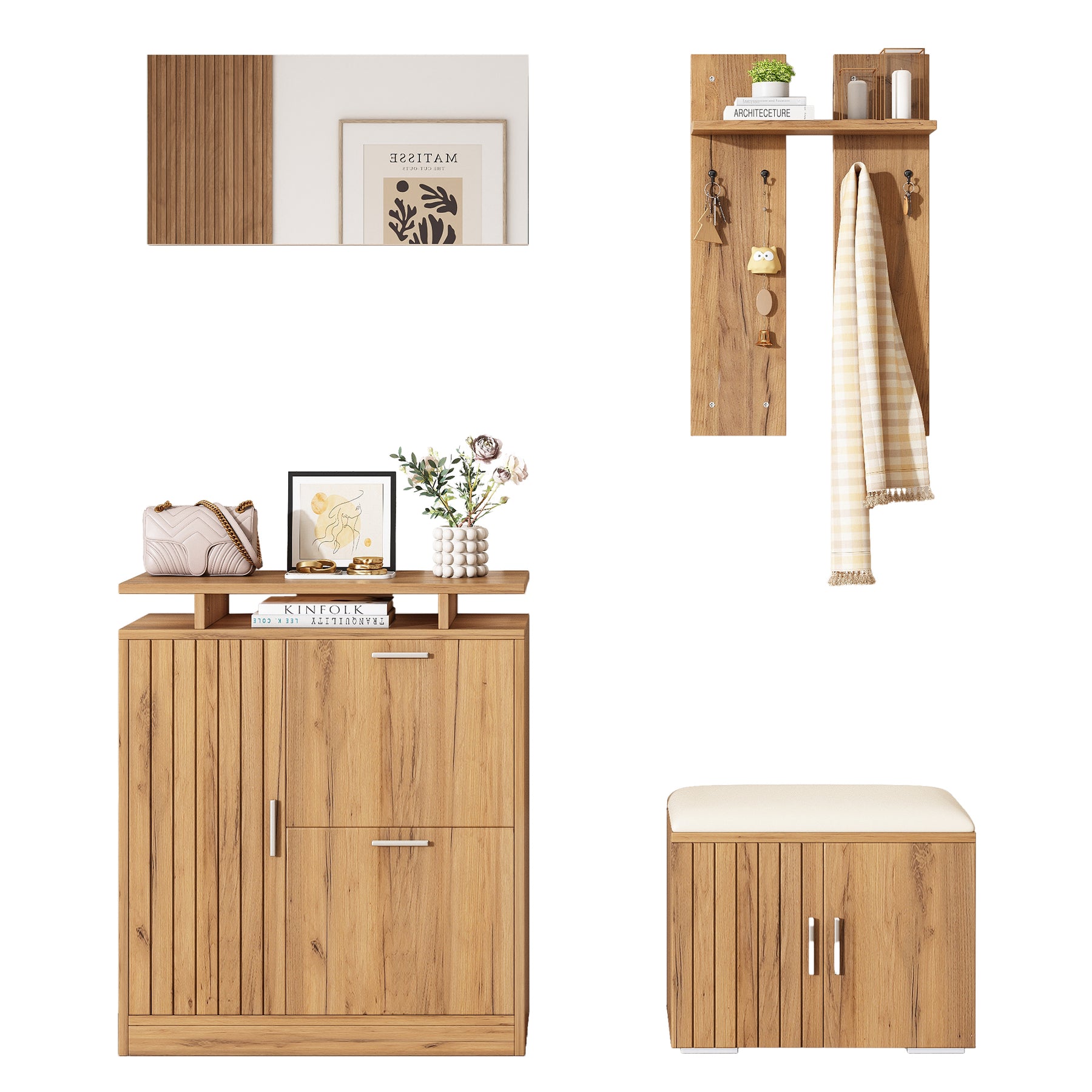 Imaginez rentrer chez vous après une longue journée et être accueilli par un espace d'entrée parfaitement organisé et élégant. Ce set de meubles d'entrée multifonctionnel transforme votre hall en un lieu chaleureux et ordonné, où chaque objet trouve sa place. Grâce à son design moderne en bois naturel, il s'intègre harmonieusement à tous les styles d'intérieur, tout en offrant une solution pratique pour le rangement des chaussures, manteaux et accessoires.