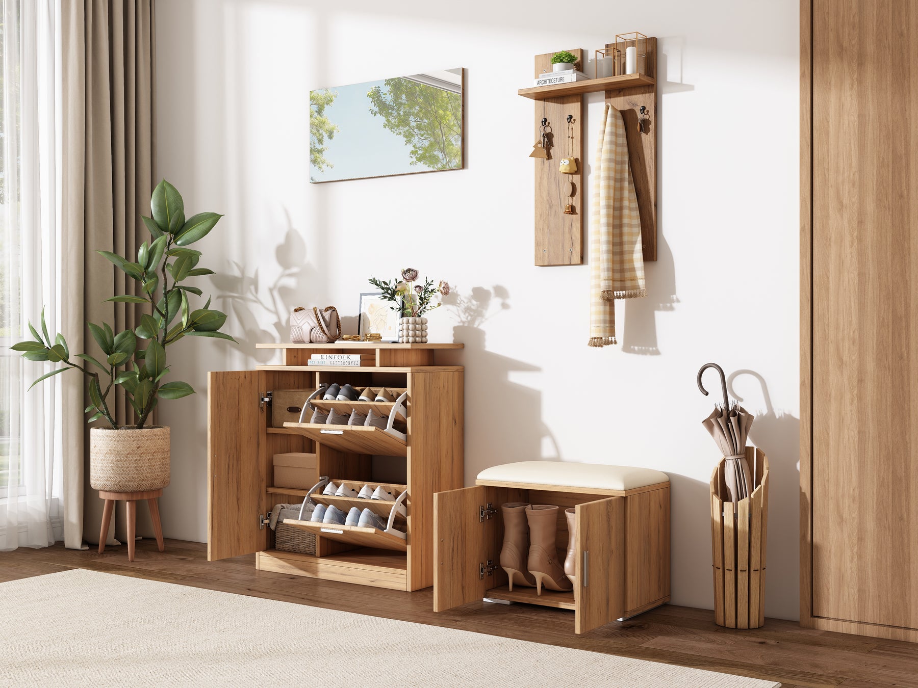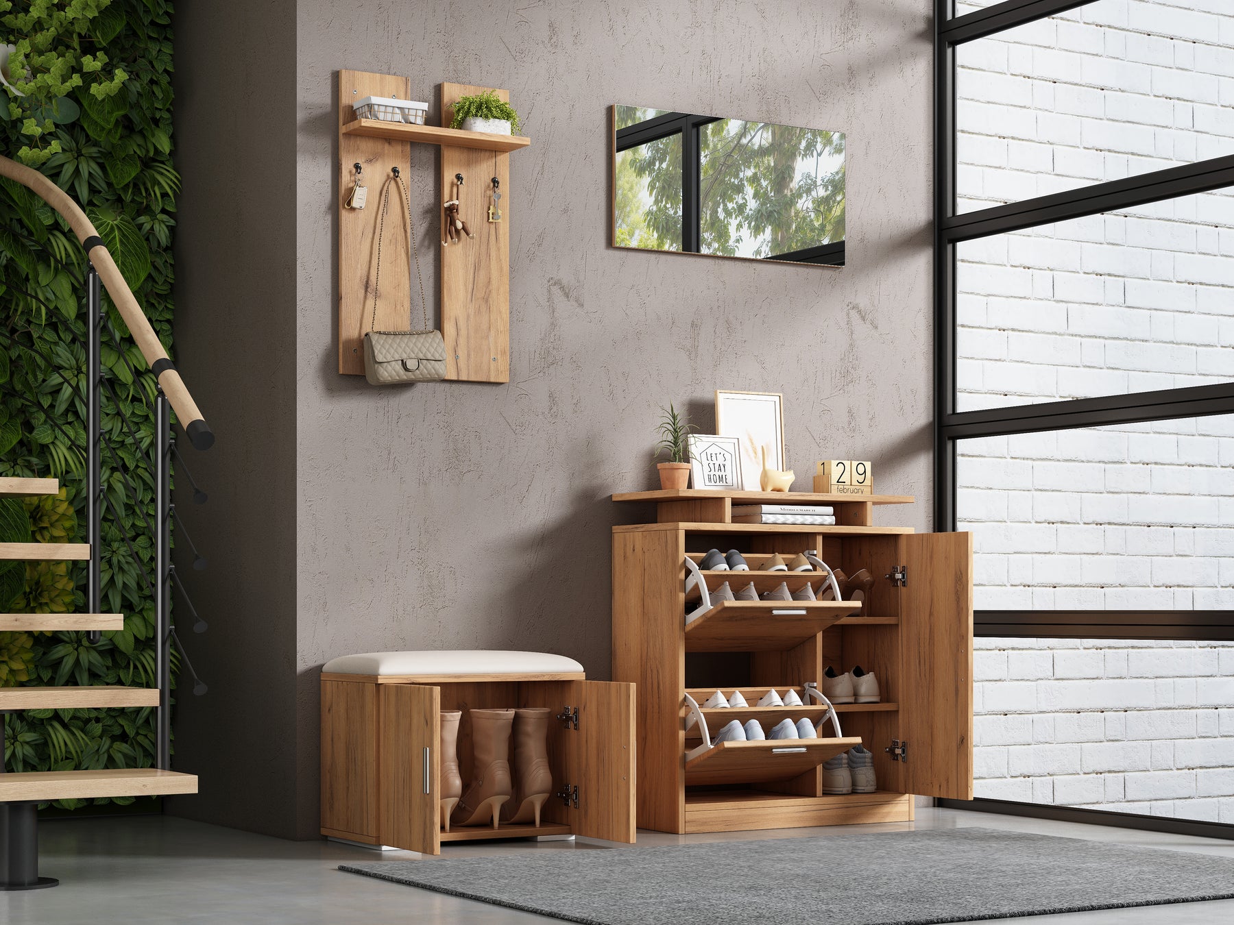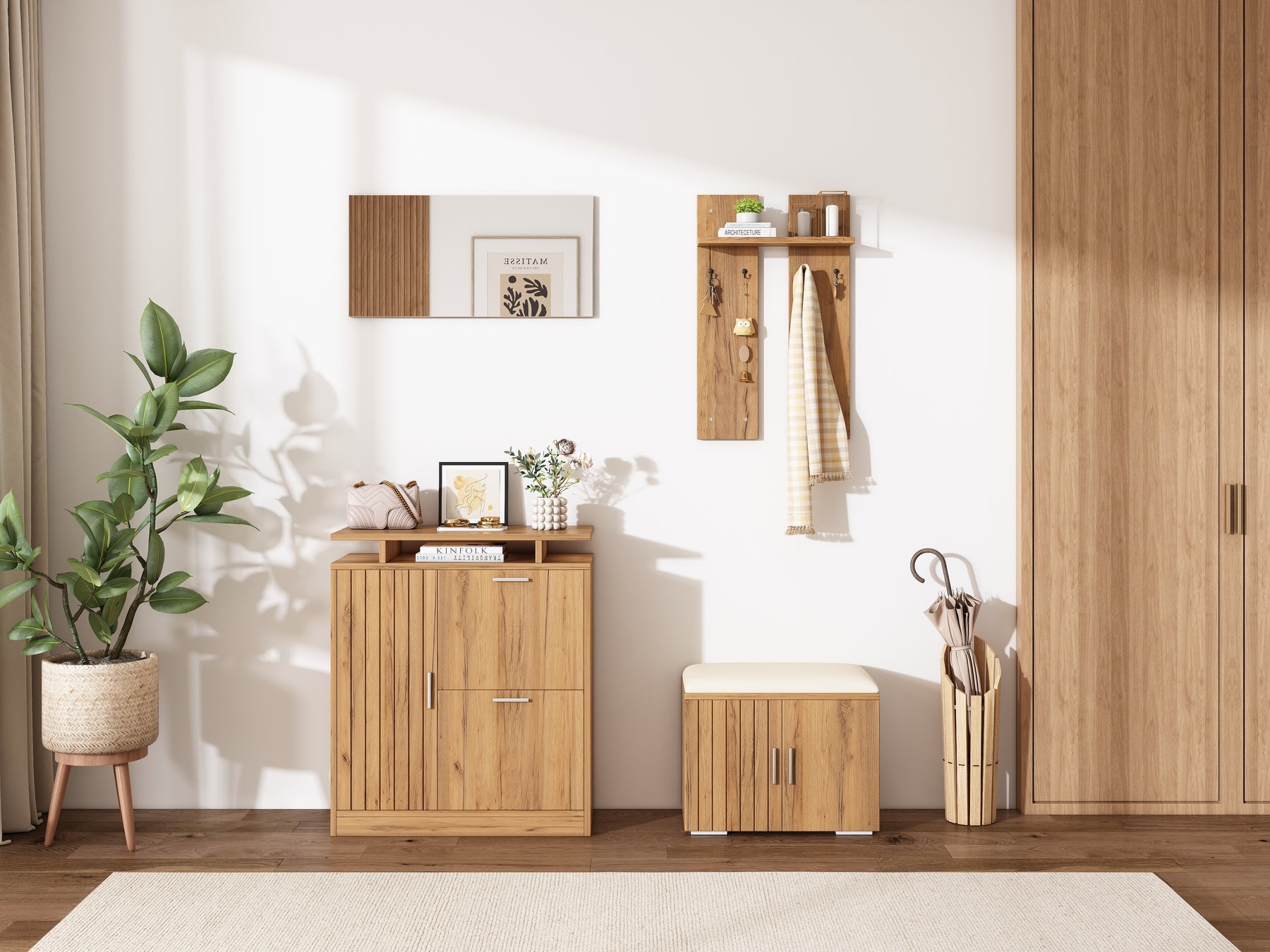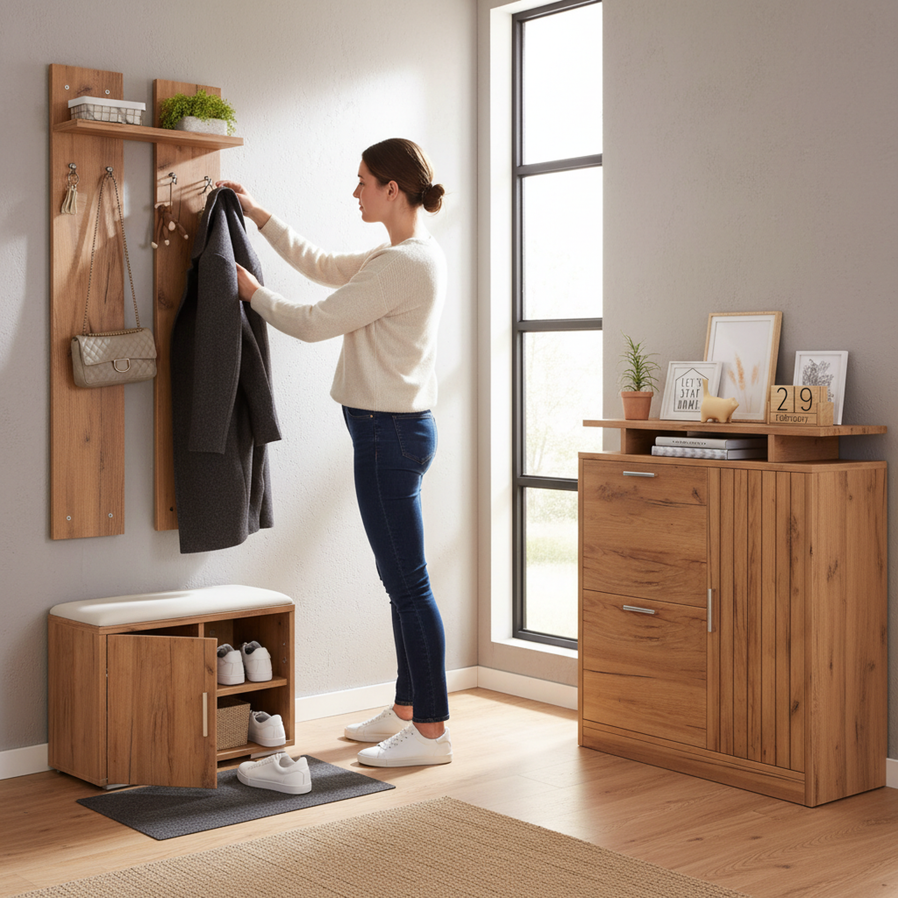 Imaginez rentrer chez vous après une longue journée et être accueilli par un espace d'entrée parfaitement organisé et élégant. Ce set de meubles d'entrée multifonctionnel transforme votre hall en un lieu chaleureux et ordonné, où chaque objet trouve sa place. Grâce à son design moderne en bois naturel, il s'intègre harmonieusement à tous les styles d'intérieur, tout en offrant une solution pratique pour le rangement des chaussures, manteaux et accessoires.