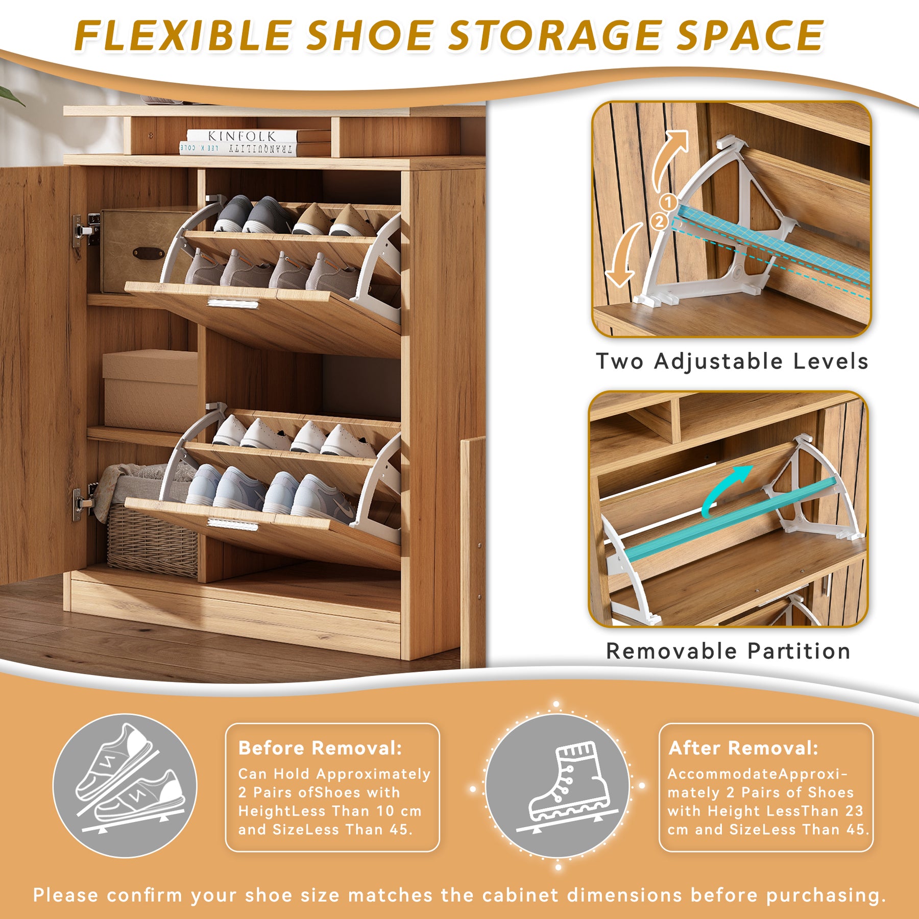 • Rangement optimisé : Les deux niveaux réglables et la cloison amovible du meuble à chaussures permettent d'adapter l'espace selon vos besoins, pour accueillir chaussures de toutes tailles et accessoires.