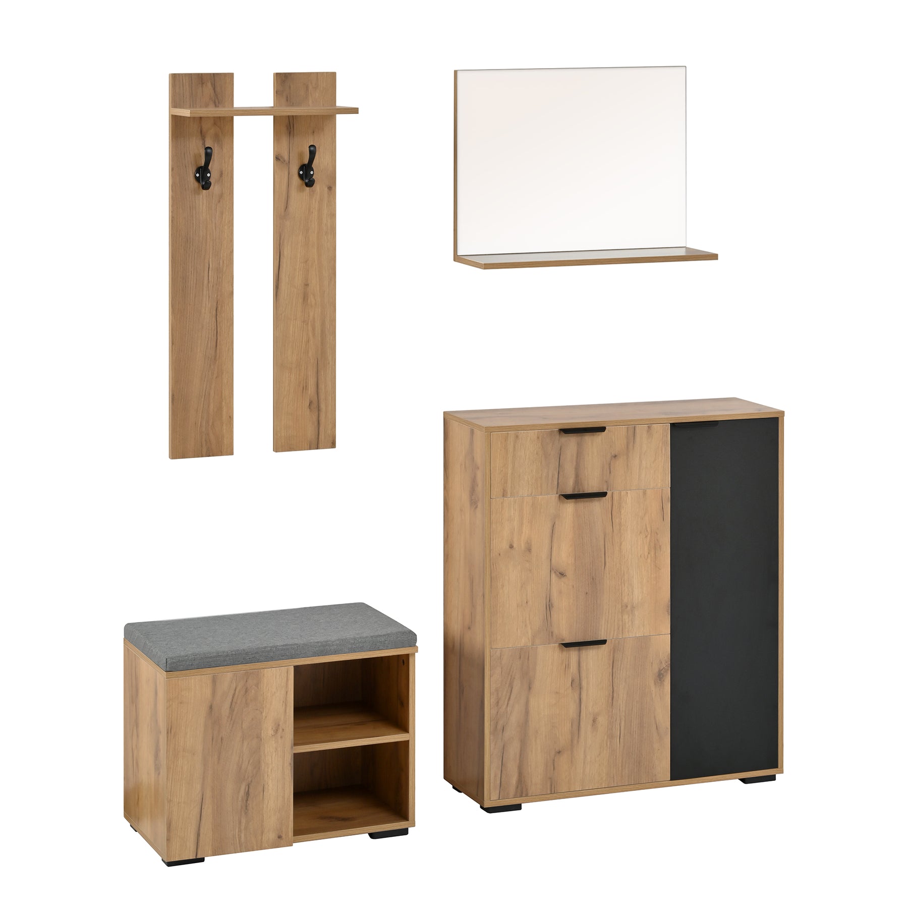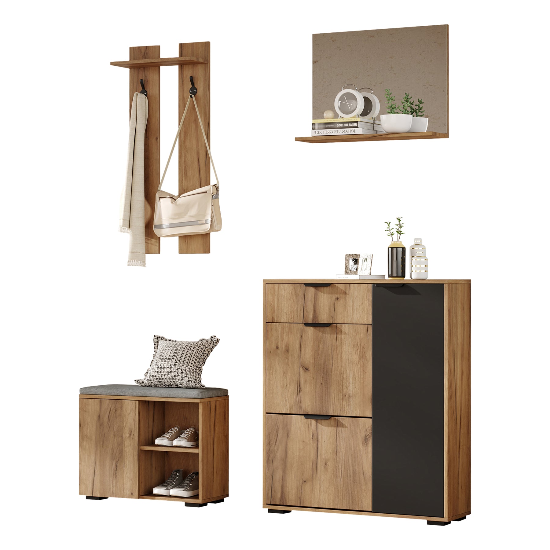 Imaginez rentrer chez vous après une longue journée et être accueilli par un espace d'entrée parfaitement organisé et élégant. Ce meuble d'entrée multifonctionnel transforme votre couloir en un lieu chaleureux et ordonné, où chaque objet trouve sa place. Grâce à son design moderne en bois naturel et noir, il s'intègre harmonieusement à tous les styles d'intérieur, tout en offrant une solution de rangement complète pour chaussures, manteaux et accessoires.