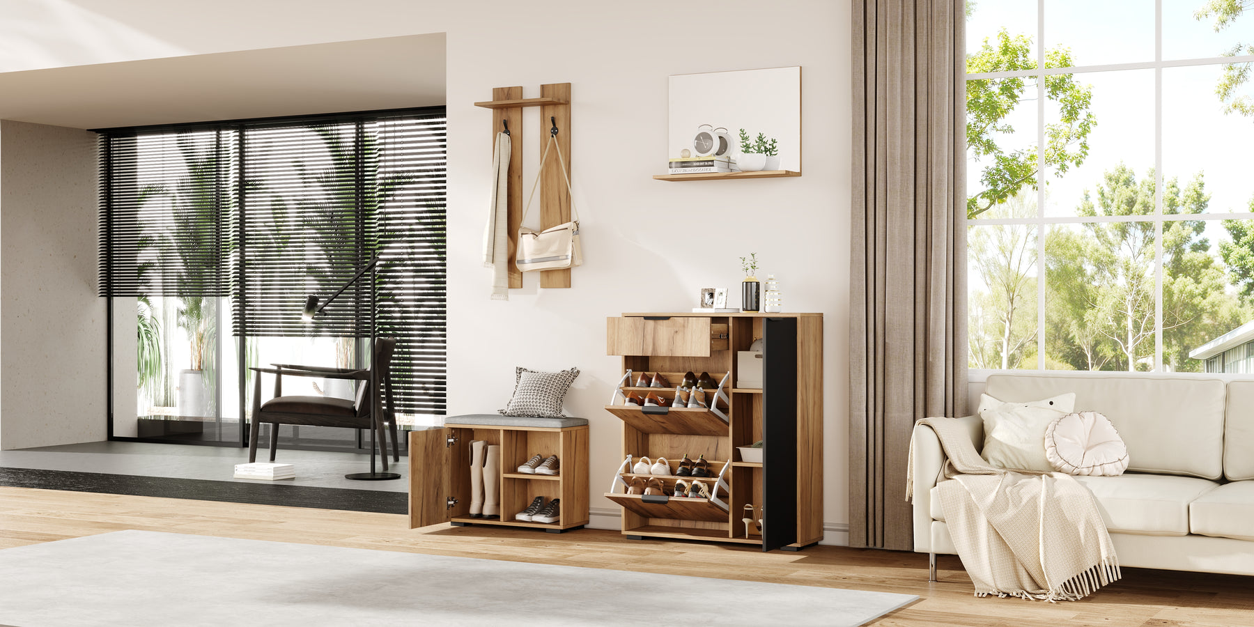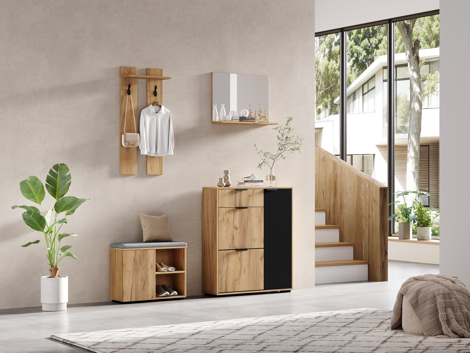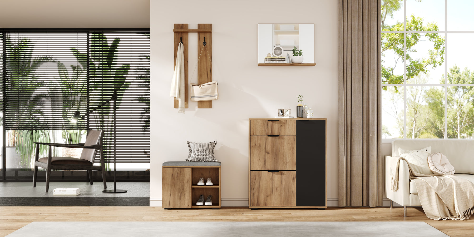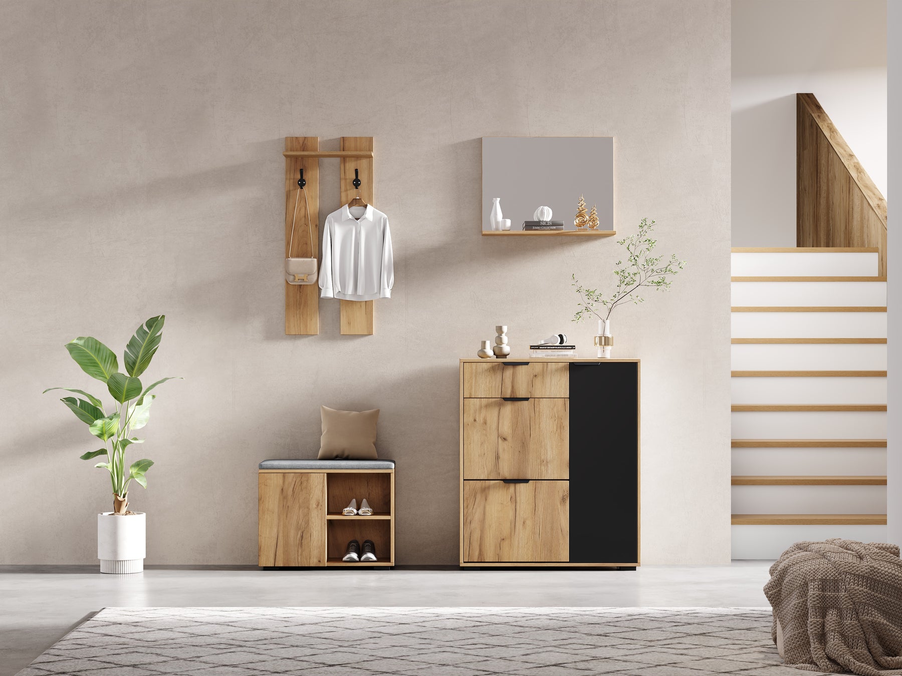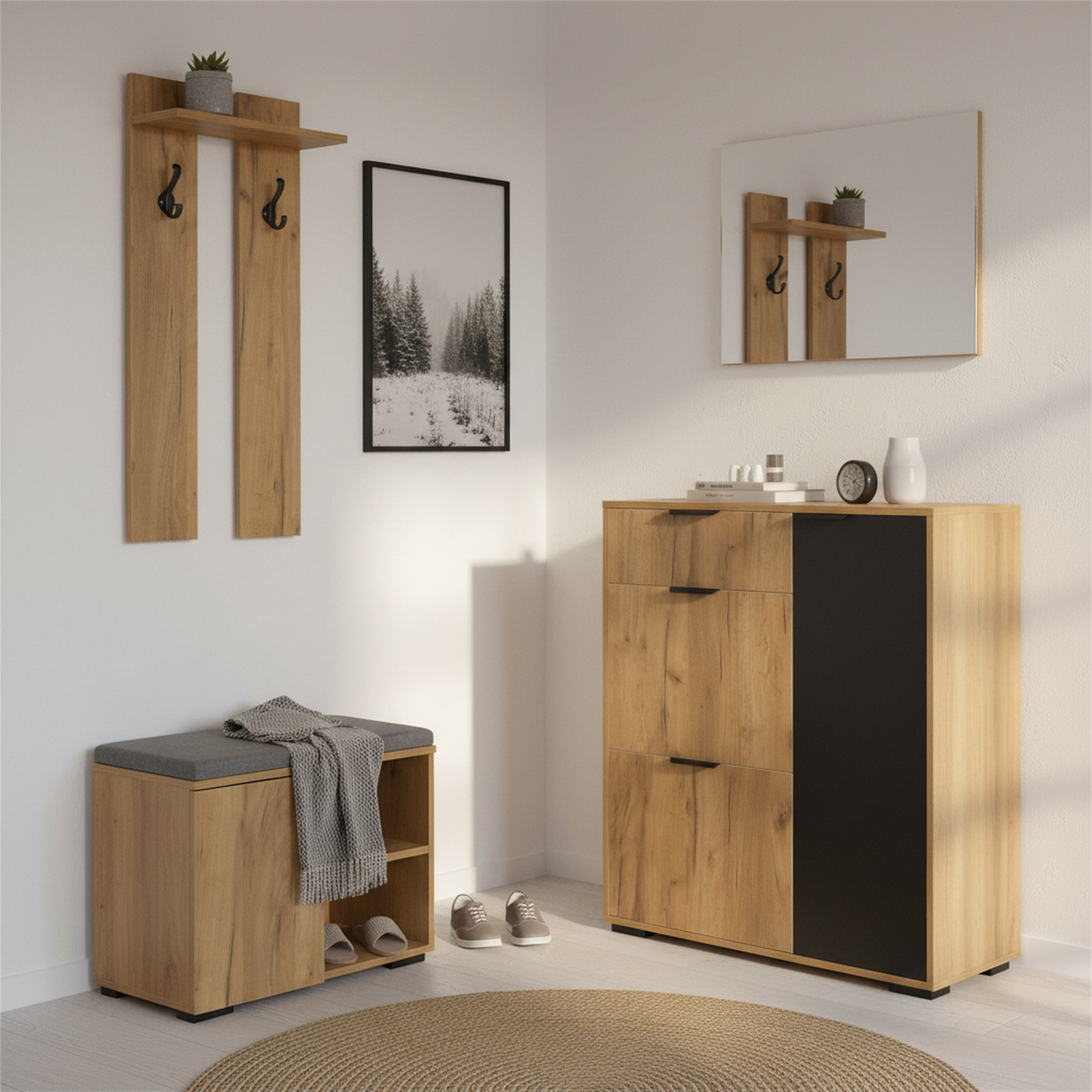 - Design moderne et harmonieux : L'association du bois naturel et du noir apporte une touche contemporaine à votre entrée, tout en restant facile à assortir avec votre décoration existante.