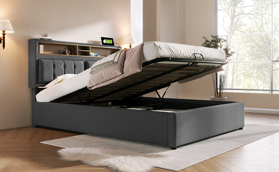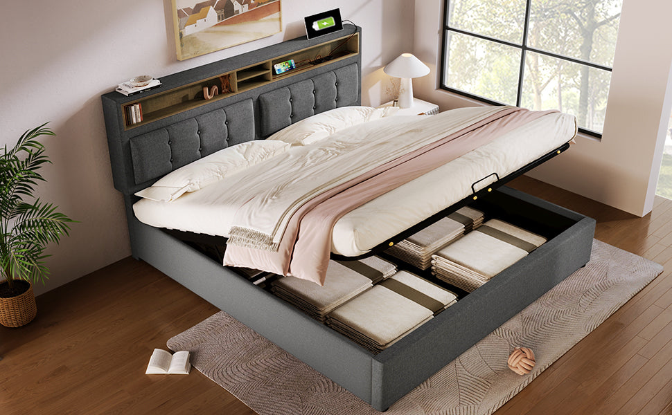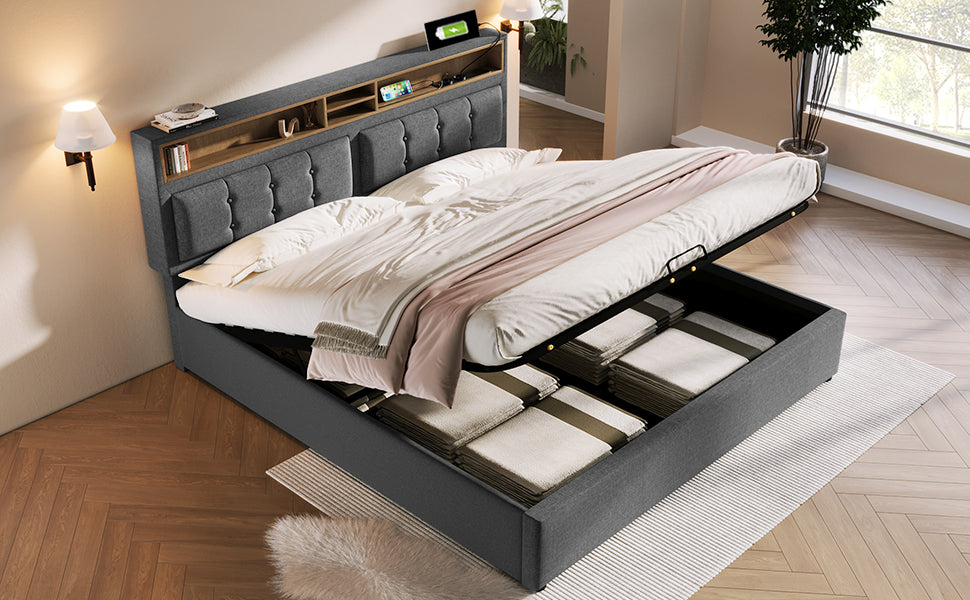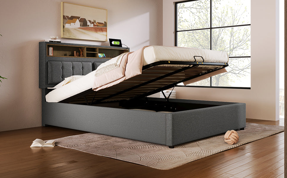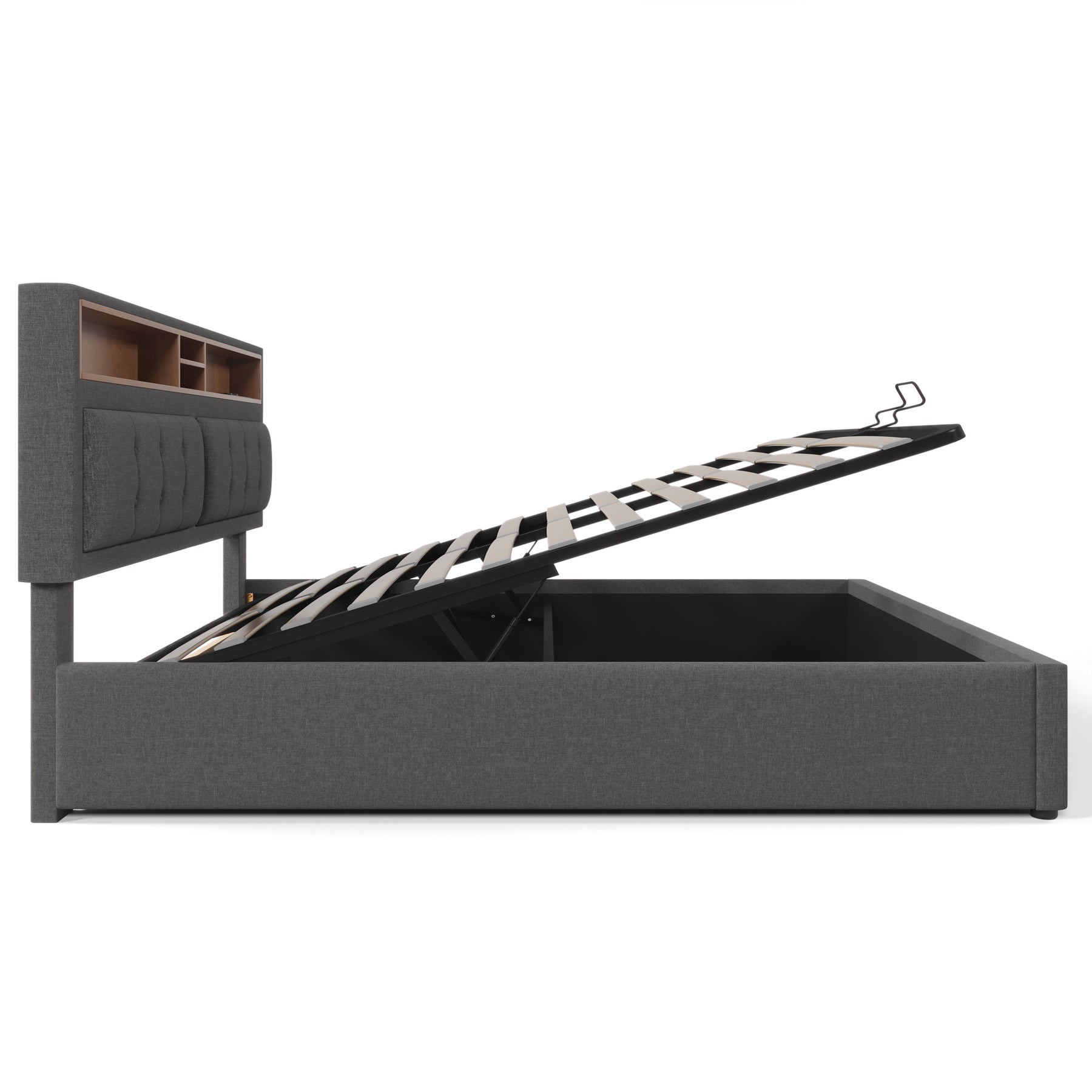 Lit coffre queen tissu gris avec port USB C et rangement 160*200cm (matelas non inclus) FAT
