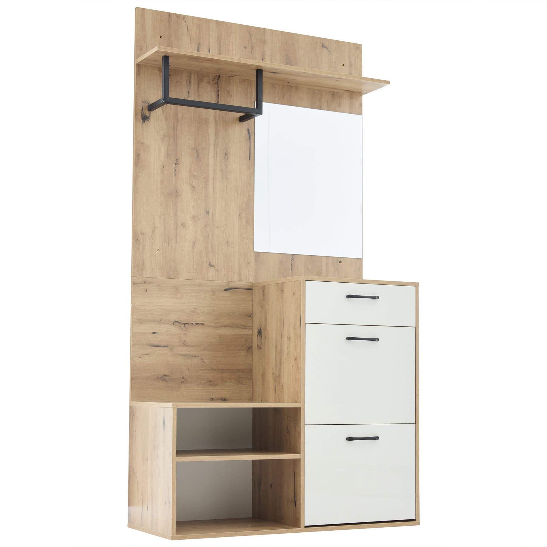 - Praticité au quotidien : Les tiroirs et étagères semi-ouvertes facilitent l'accès aux objets du quotidien, tandis que le miroir intégré vous permet de vérifier votre look en un clin d'œil.