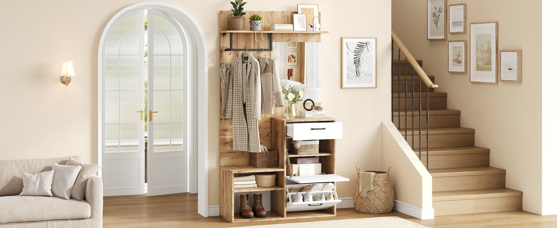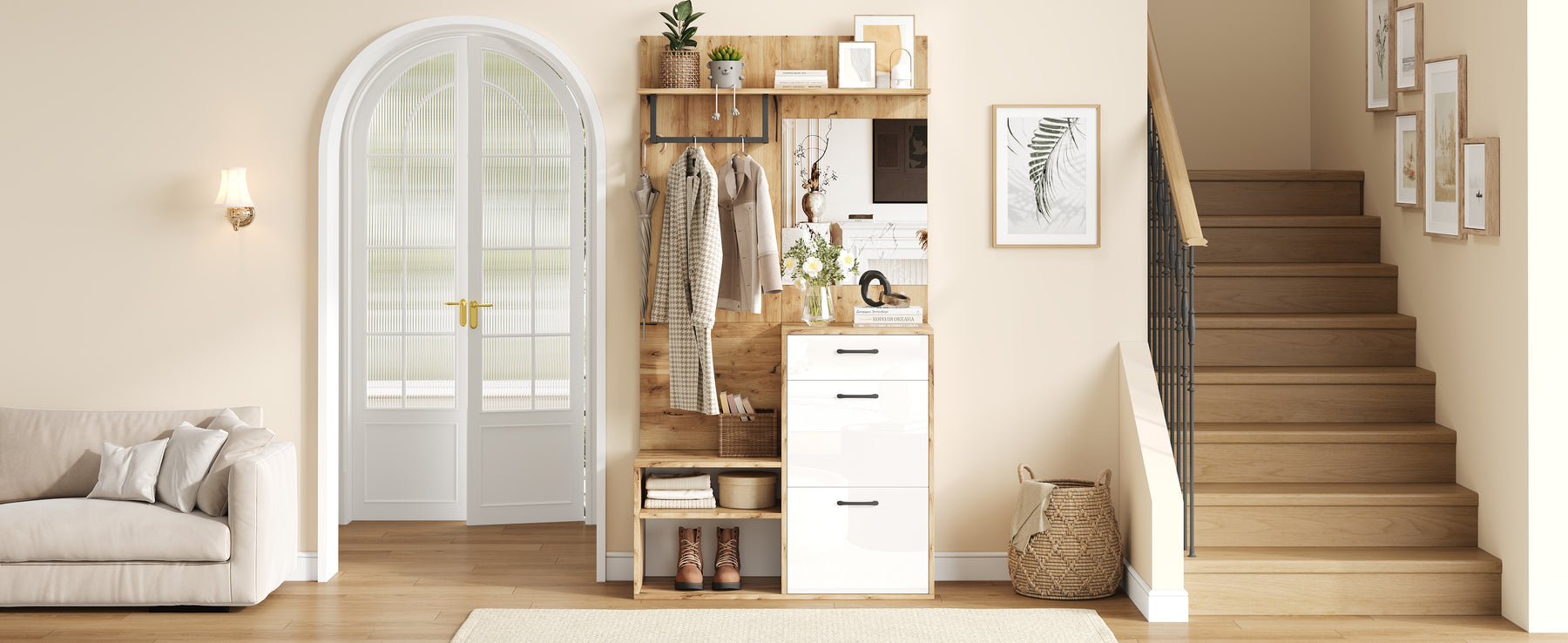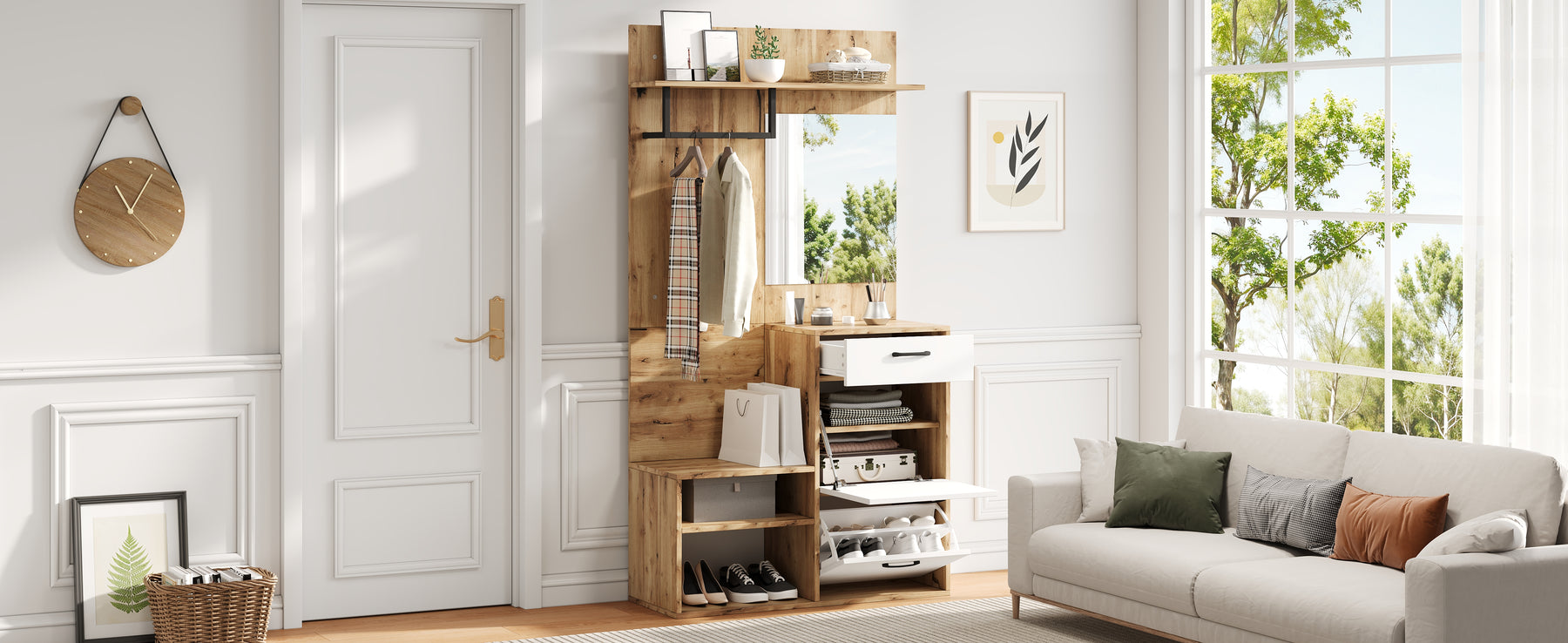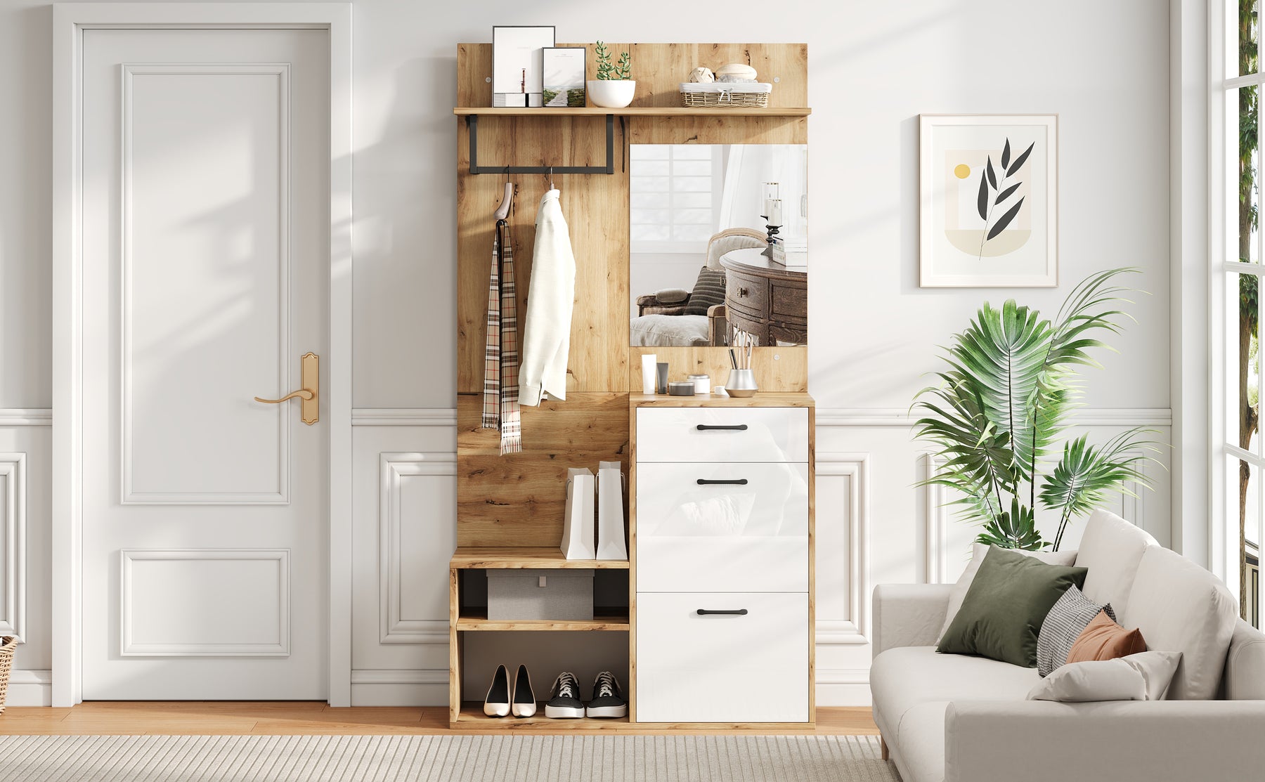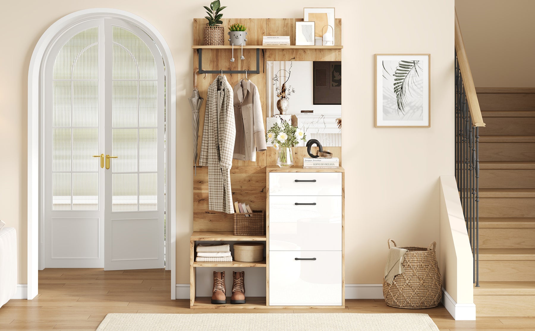 - Multifonctionnalité : Vestiaire, banc à chaussures, armoire et miroir réunis en un seul meuble, pour une organisation parfaite et un gain de temps chaque matin.