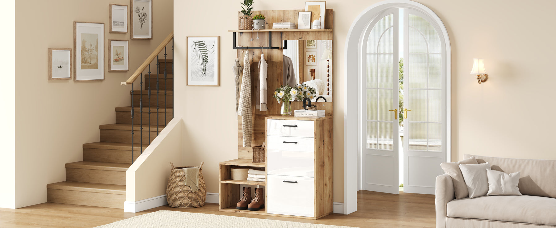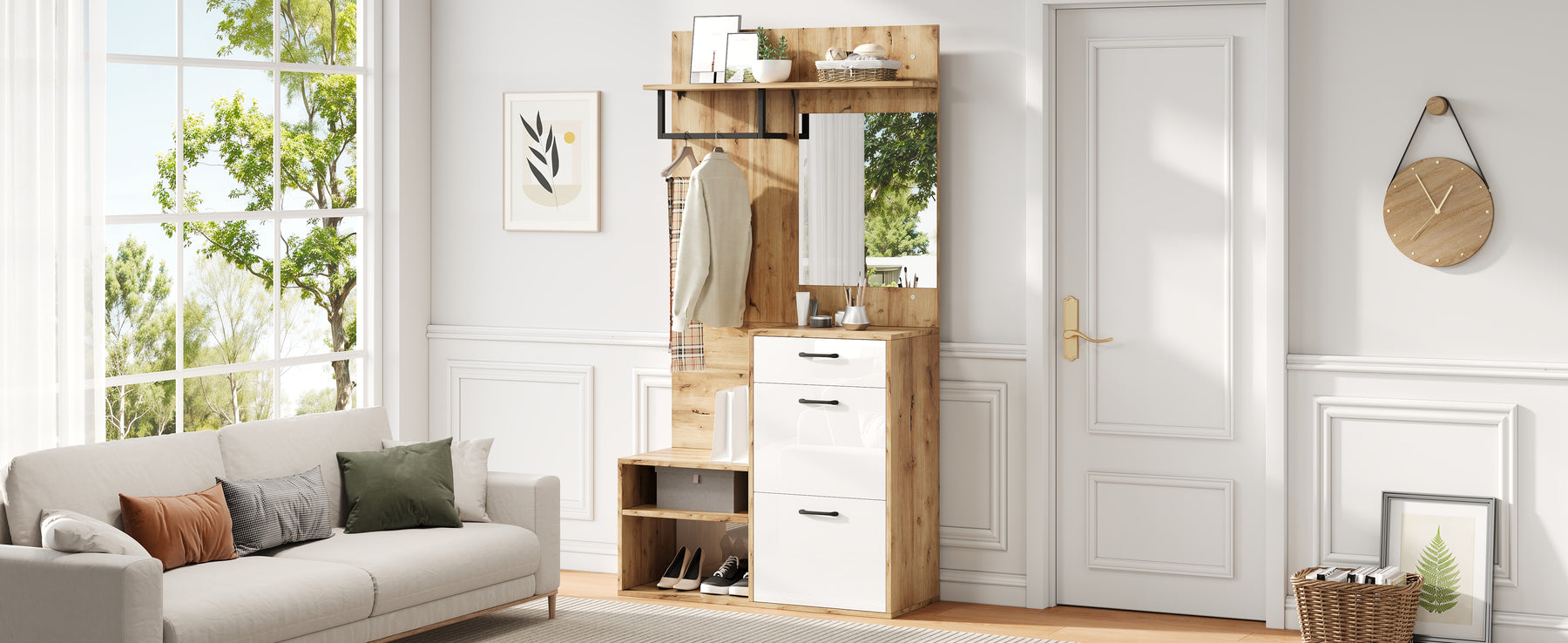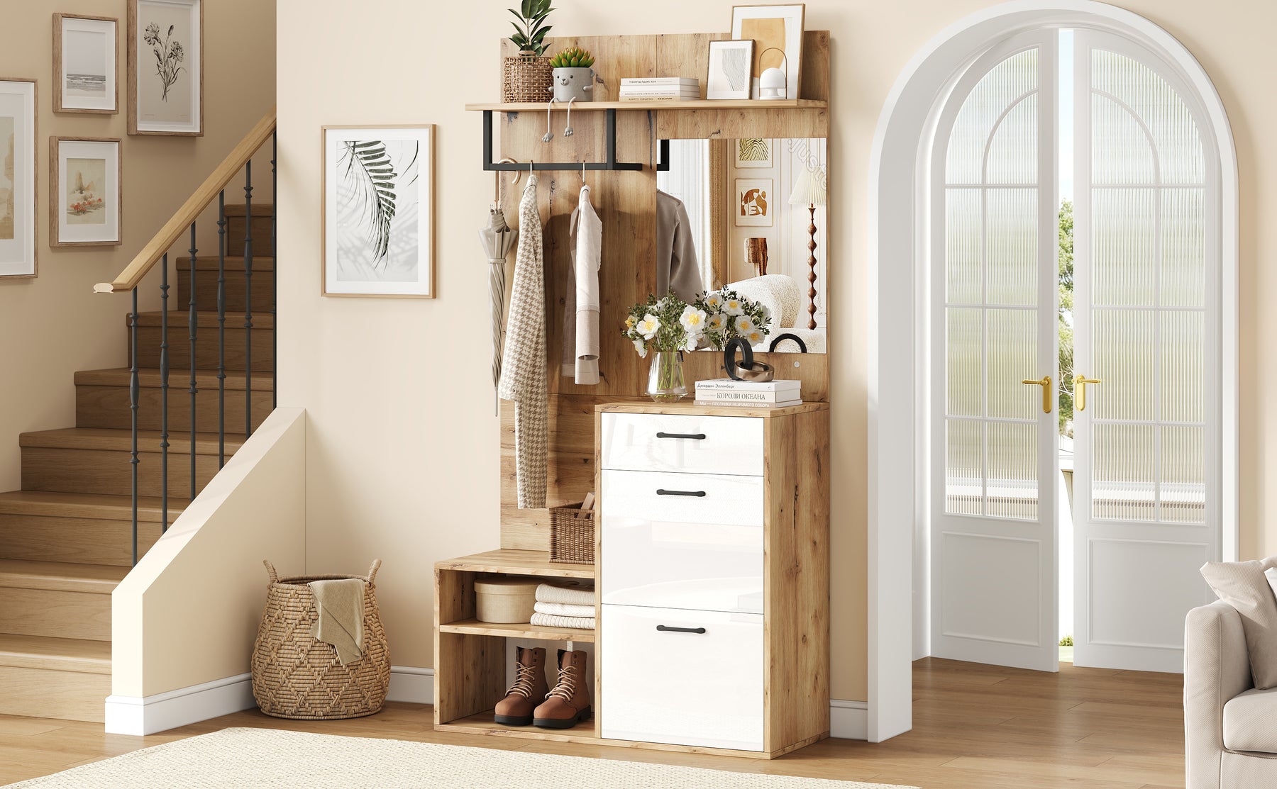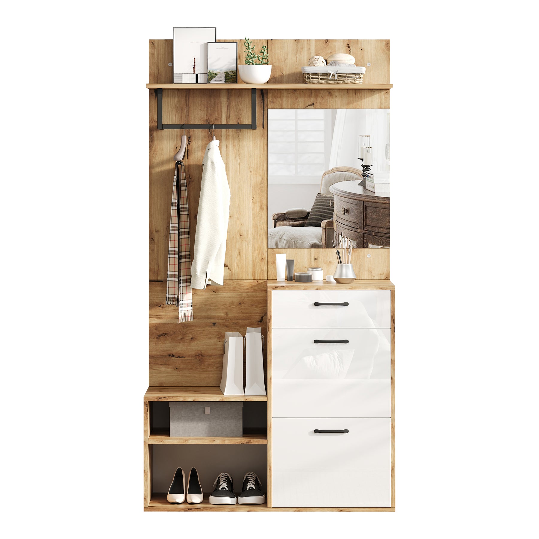 Imaginez rentrer chez vous après une longue journée et être accueilli par une entrée parfaitement organisée et élégante. Ce set de meubles d'entrée multifonctionnel transforme votre hall en un espace chaleureux et ordonné. Accrochez vos manteaux, rangez vos chaussures et asseyez-vous confortablement pour vous déchausser. Grâce à son miroir intégré, vérifiez votre tenue avant de sortir, tandis que les tiroirs et placards dissimulent habilement vos accessoires et petits objets. Le design blanc brillant associé à la couleur bois naturel apporte une touche de modernité et de douceur à votre intérieur, tout en optimisant chaque centimètre de votre espace. Profitez d'une entrée accueillante, pratique et stylée, pensée pour simplifier votre quotidien.