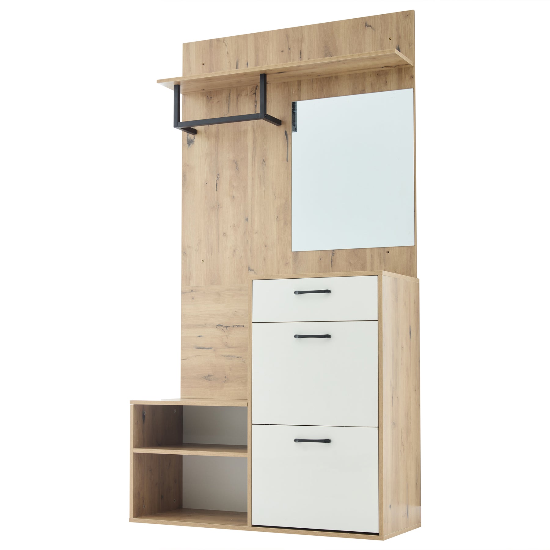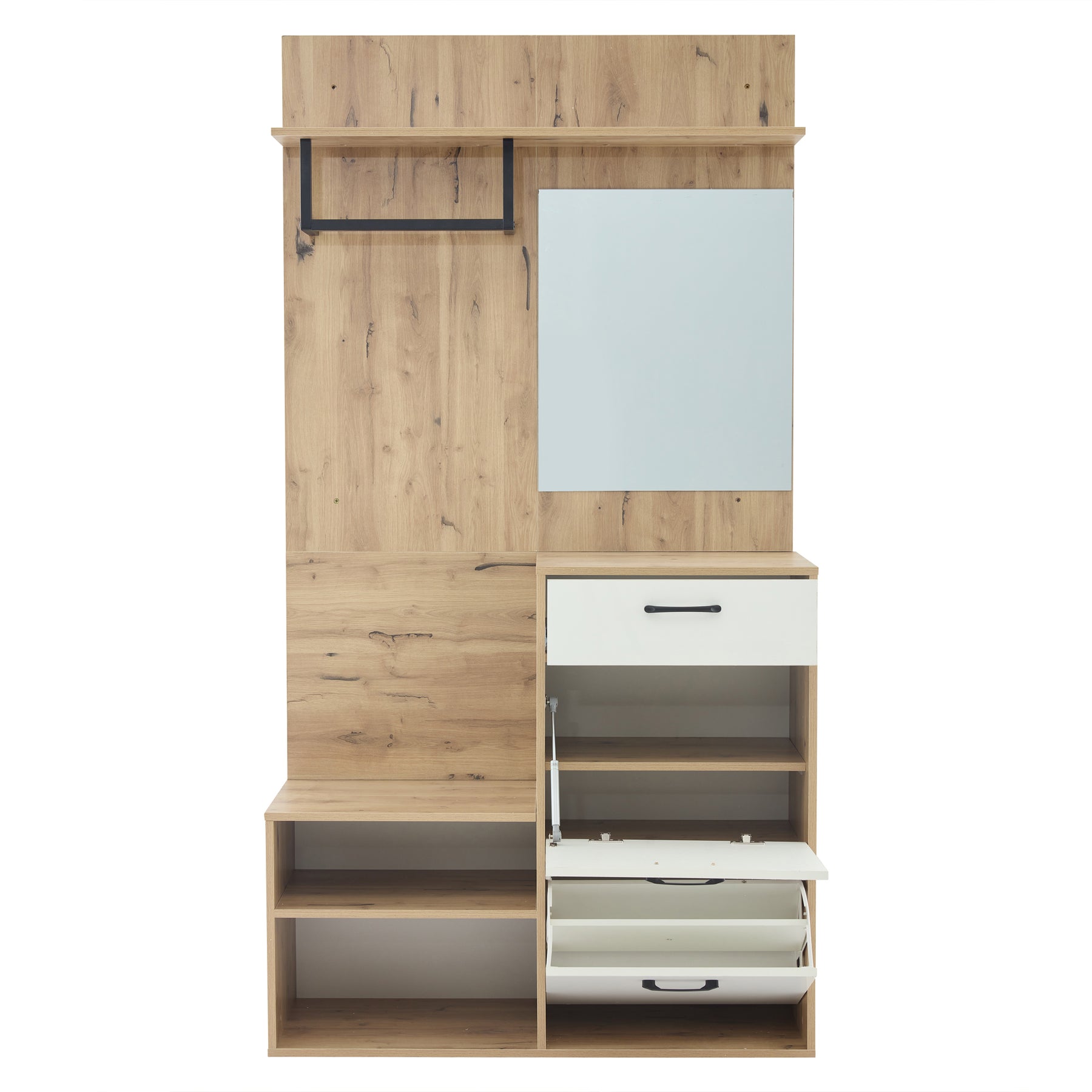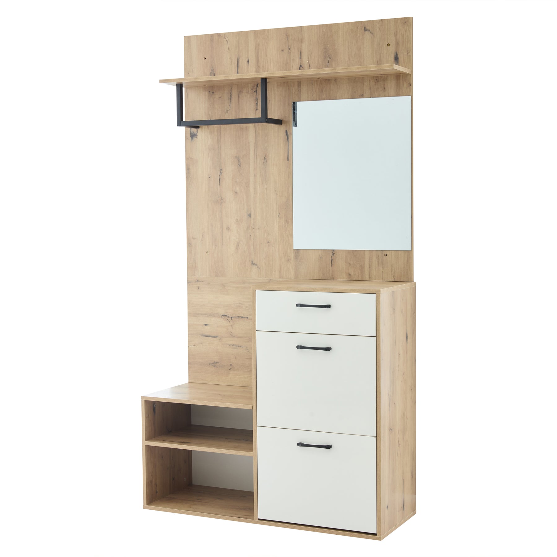 Vestiaire à l'entrée effet bois et blanc avec miroir, banc à chaussures 100x38,5x190cm AURORAESS