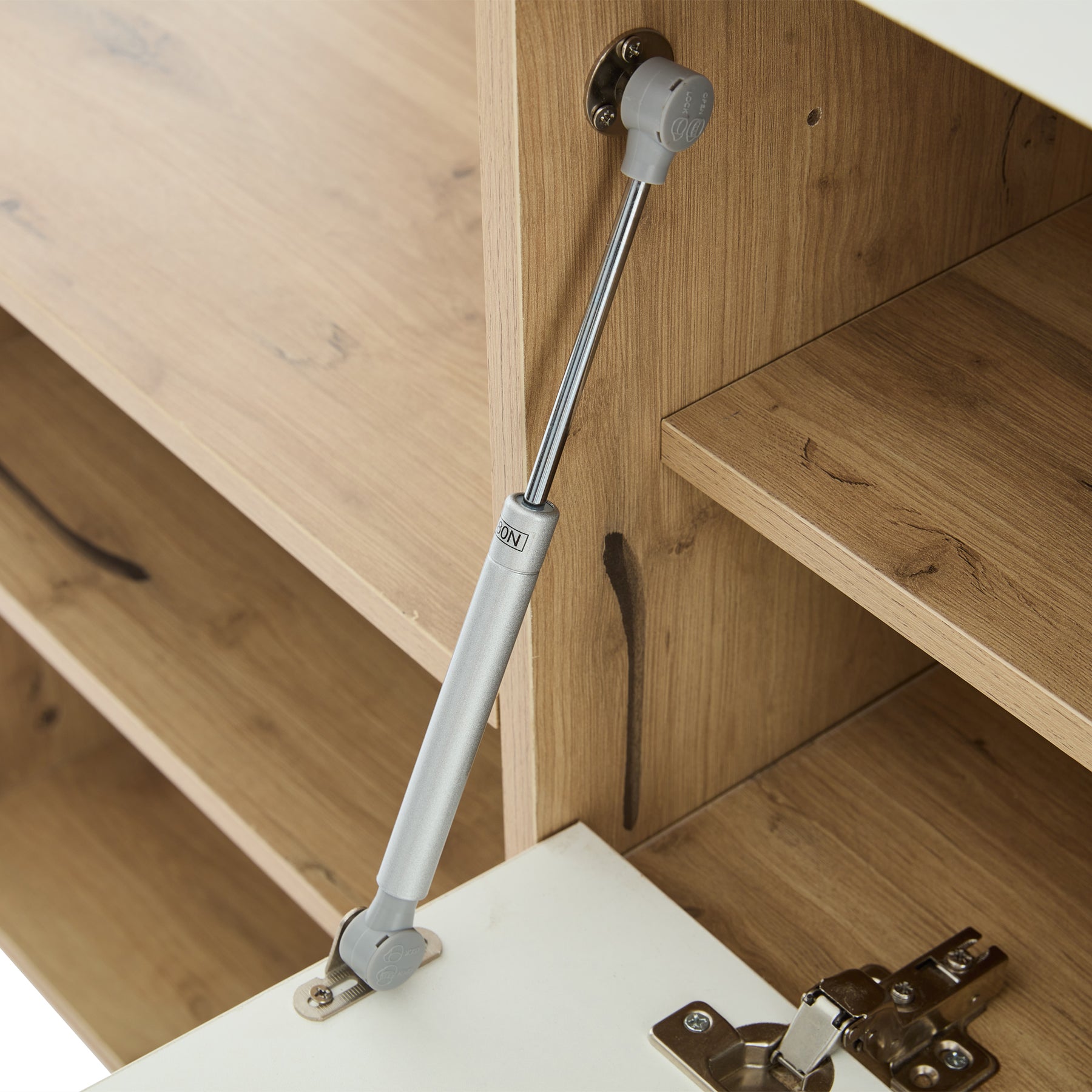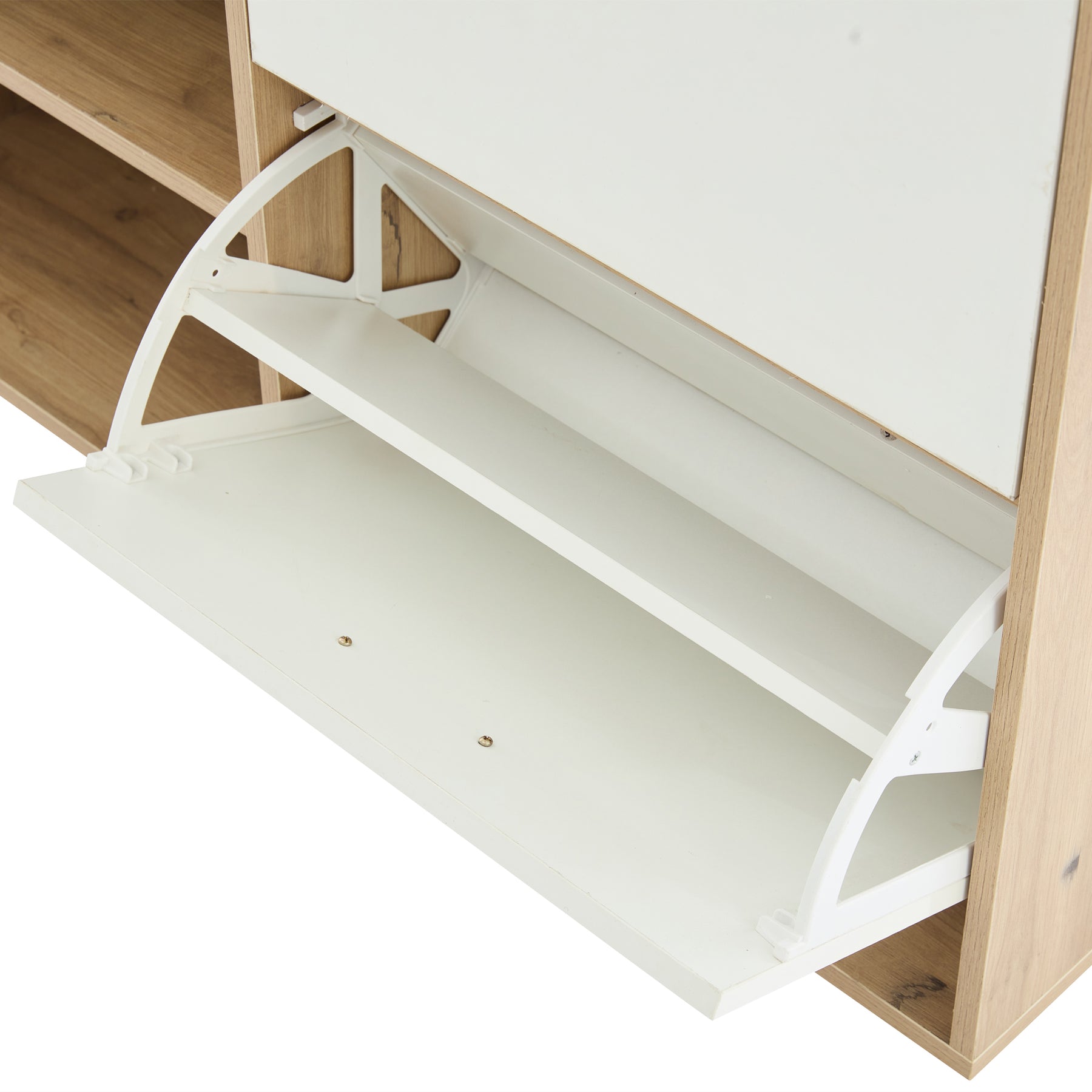 - Optimisation de l'espace : Grâce à ses portes abattantes et ses compartiments ouverts, ce meuble exploite la hauteur et la profondeur du couloir, offrant un rangement généreux sans encombrer le passage.