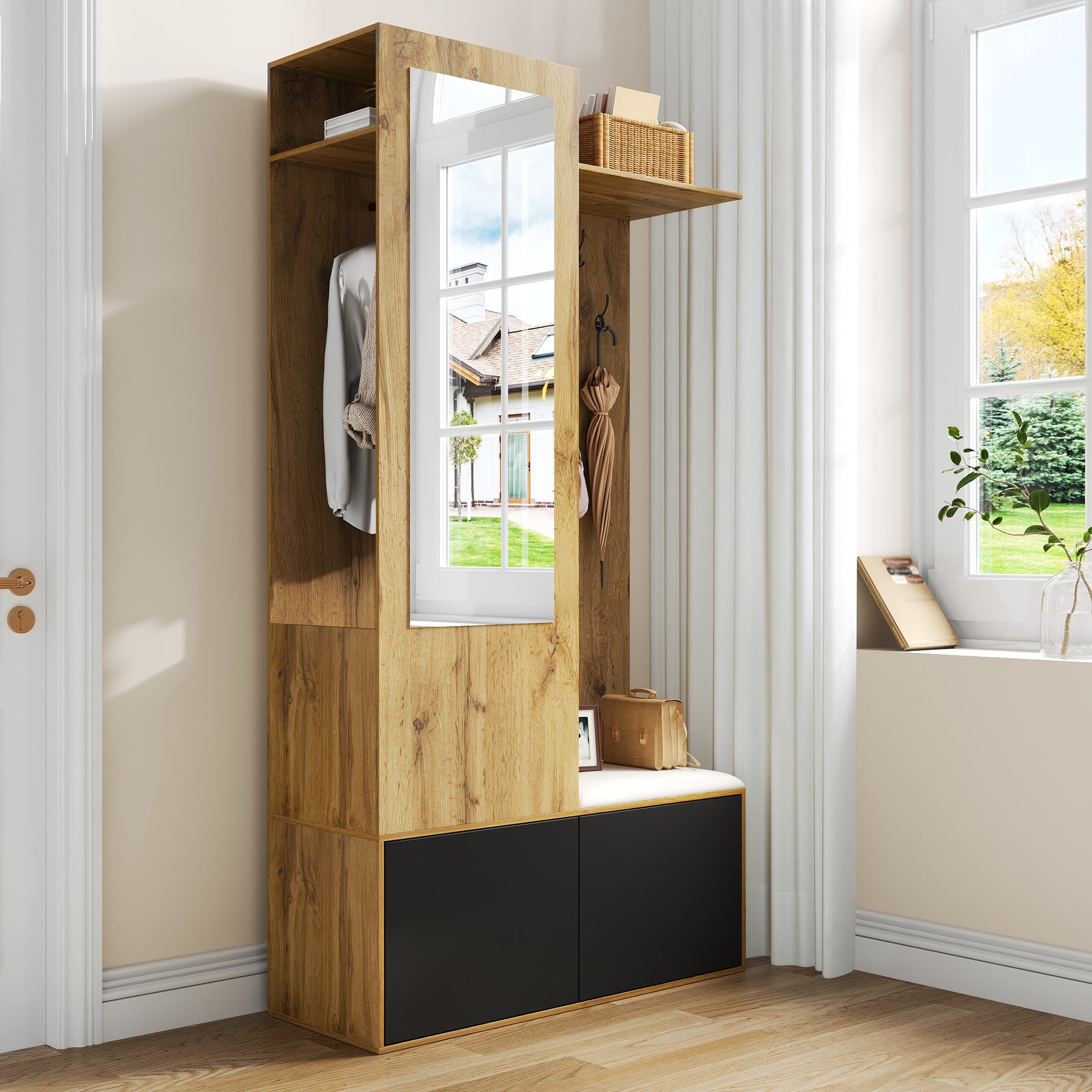 Imaginez rentrer chez vous après une longue journée et être accueilli par un espace d’entrée à la fois élégant et parfaitement organisé. Ce vestiaire moderne en noir et bois transforme votre couloir en un lieu chaleureux et fonctionnel. Grâce à ses cinq crochets robustes, chaque manteau, sac ou accessoire trouve sa place, évitant le désordre habituel. Les deux armoires à chaussures fermées offrent un rangement discret pour 8 à 10 paires, gardant le sol dégagé et propre. Asseyez-vous confortablement sur le banc intégré pour enfiler ou retirer vos chaussures, un vrai plaisir au quotidien. Le grand miroir sur la porte agrandit visuellement l’espace et cache un porte-cintres supplémentaire, idéal pour suspendre vos vêtements de saison. L’étagère supérieure accueille sacs, chapeaux ou accessoires, pour un couloir toujours ordonné. Fabriqué en MDF de qualité, ce meuble allie robustesse et design contemporain, s’adaptant à tous les styles d’intérieur. Offrez-vous une entrée harmonieuse, où chaque détail est pensé pour simplifier votre quotidien et valoriser votre espace.