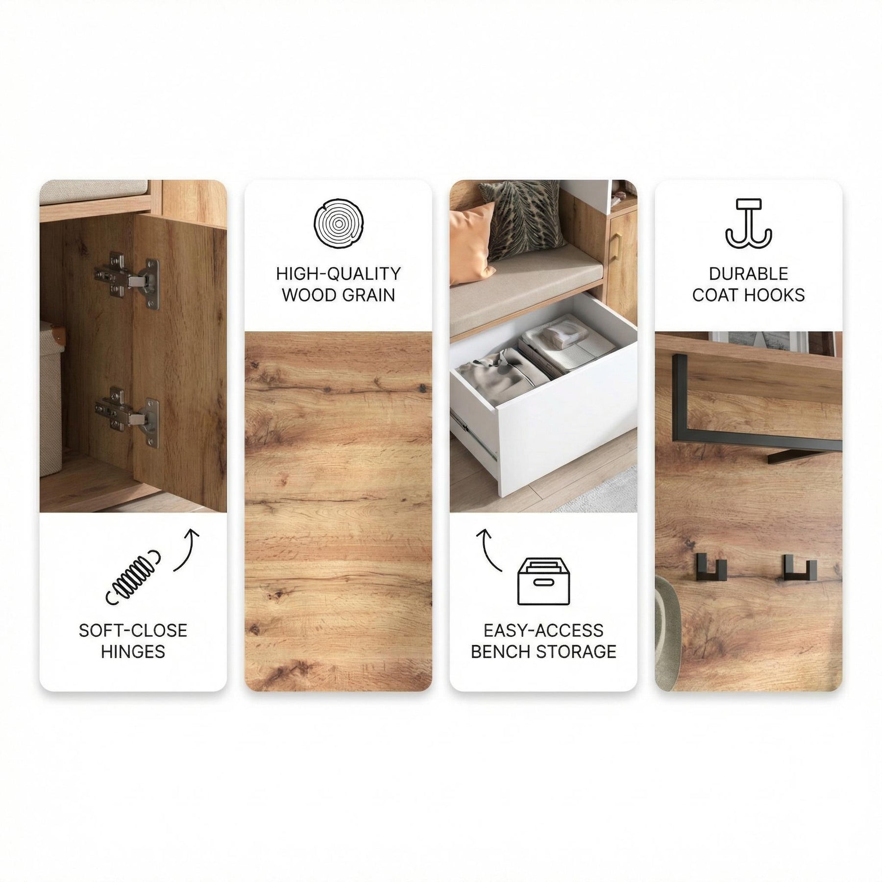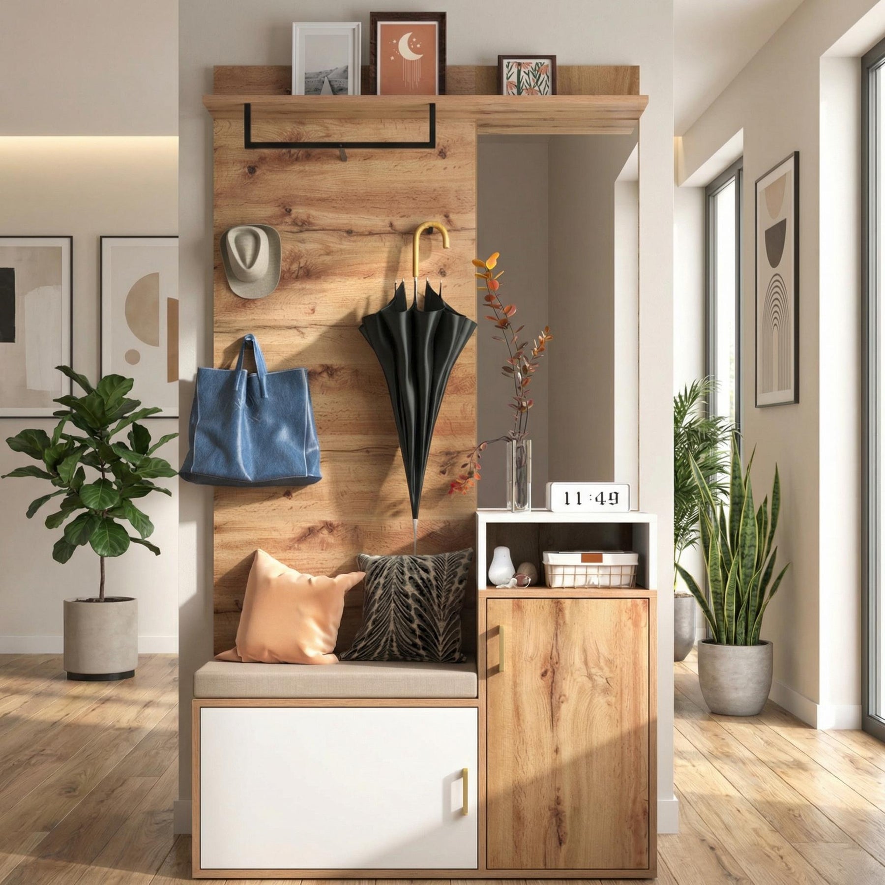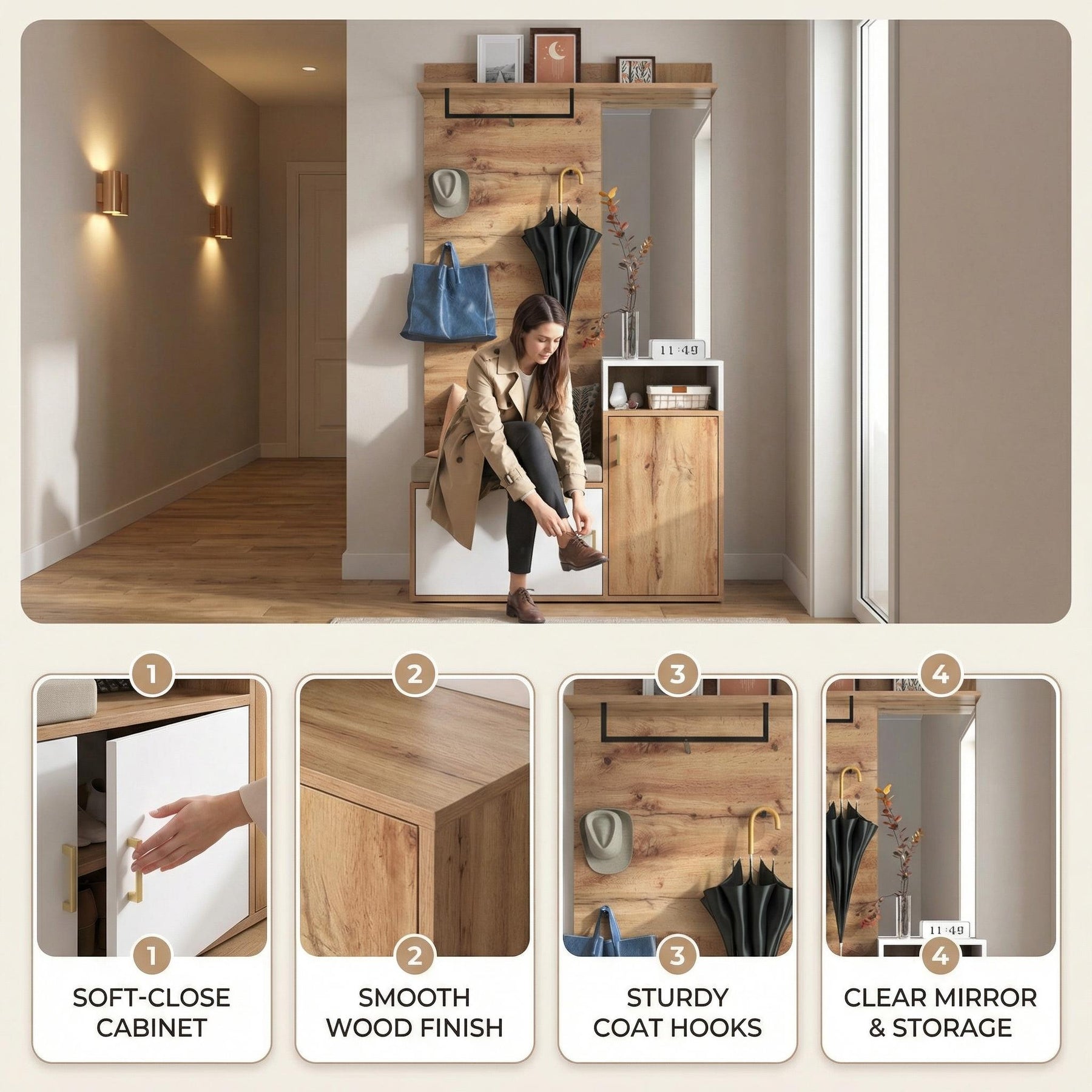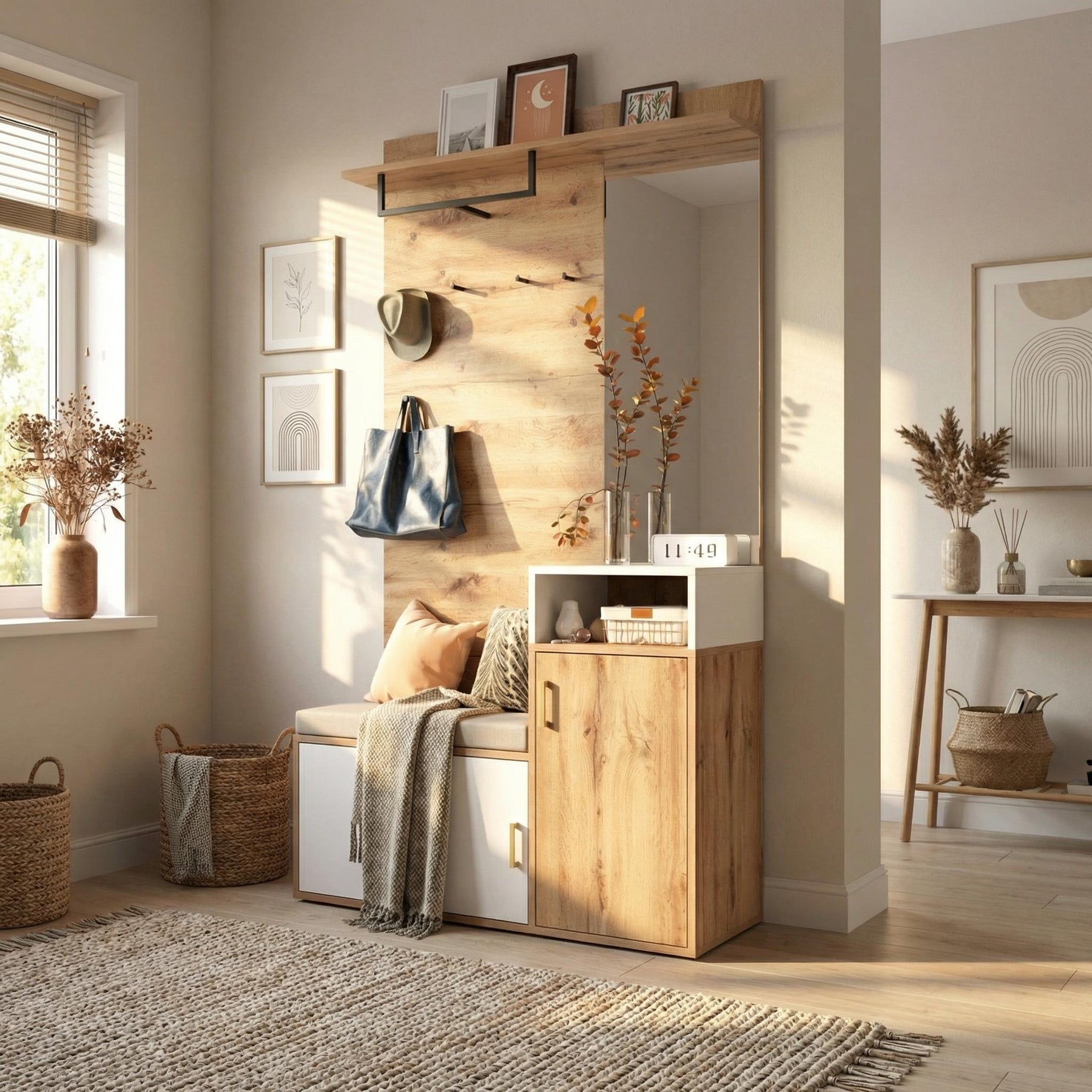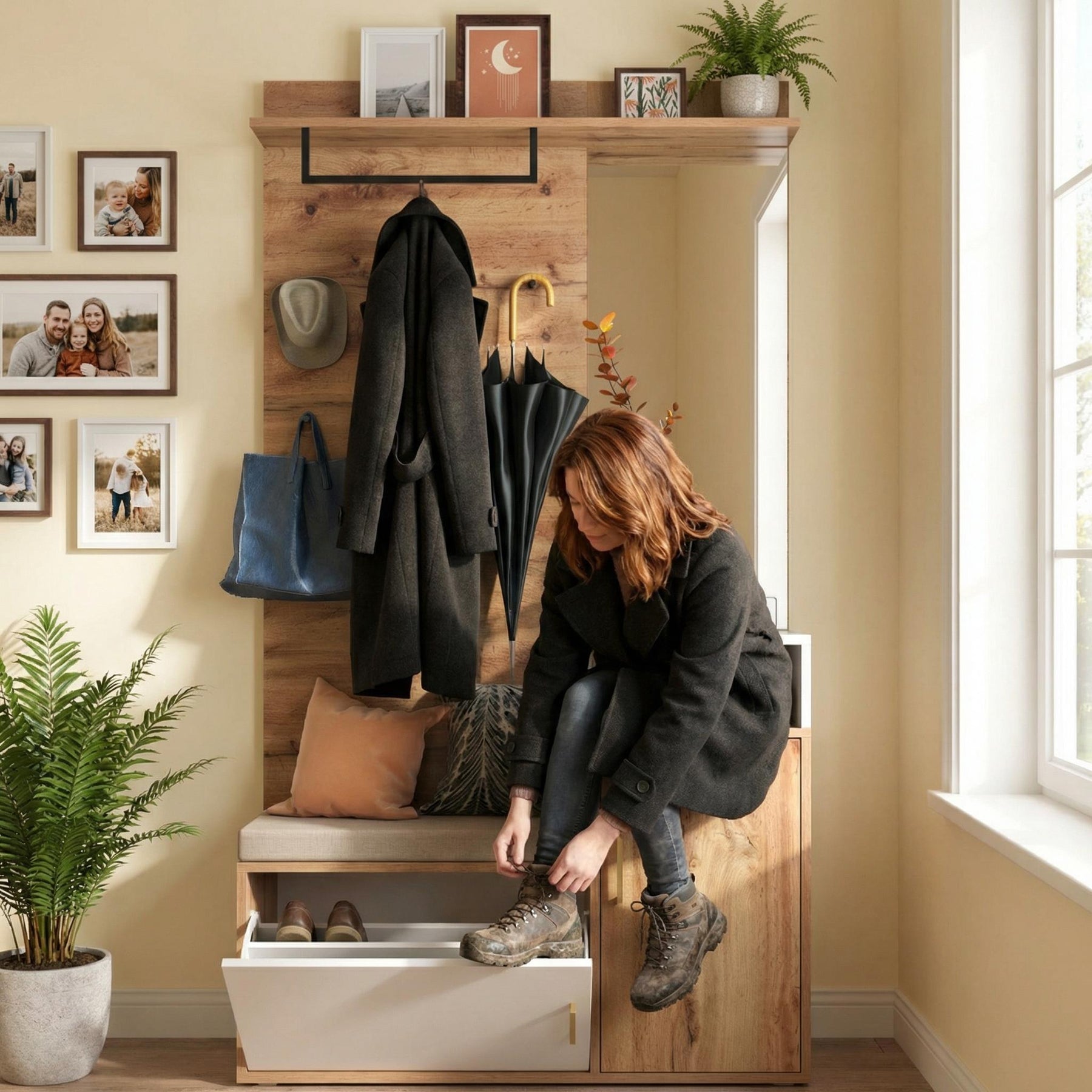 Imaginez rentrer chez vous après une longue journée et être accueilli par un espace d’entrée organisé, lumineux et élégant. Ce meuble d’entrée blanc et bois transforme votre hall en un lieu chaleureux où chaque objet trouve sa place. Grâce à ses deux grands compartiments à chaussures, vous ne trébucherez plus sur des paires éparpillées : jusqu’à 12 paires sont soigneusement rangées. Le large miroir agrandit visuellement la pièce et vous permet de vérifier votre tenue avant de sortir. Les quatre crochets robustes et la tringle accueillent manteaux, vestes et sacs, pour un espace toujours ordonné. Le banc rembourré vous invite à vous asseoir confortablement pour enfiler vos chaussures, rendant chaque départ ou retour à la maison plus agréable. Fabriqué en MDF et panneau de particules, ce meuble allie durabilité et design moderne, s’intégrant parfaitement à tous les styles d’intérieur. Grâce à une notice détaillée et des pièces numérotées, le montage est simple et rapide, pour que vous profitiez sans attendre d’un couloir transformé.