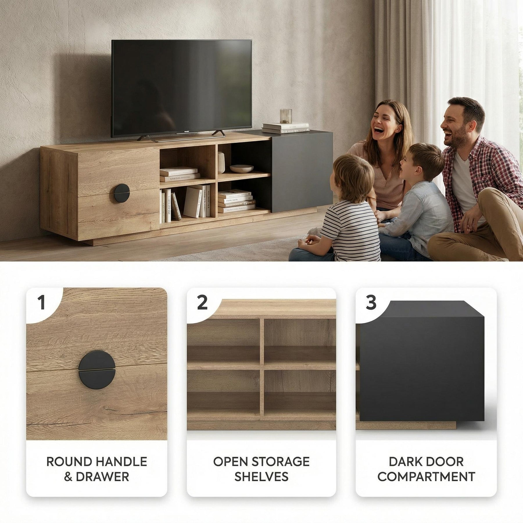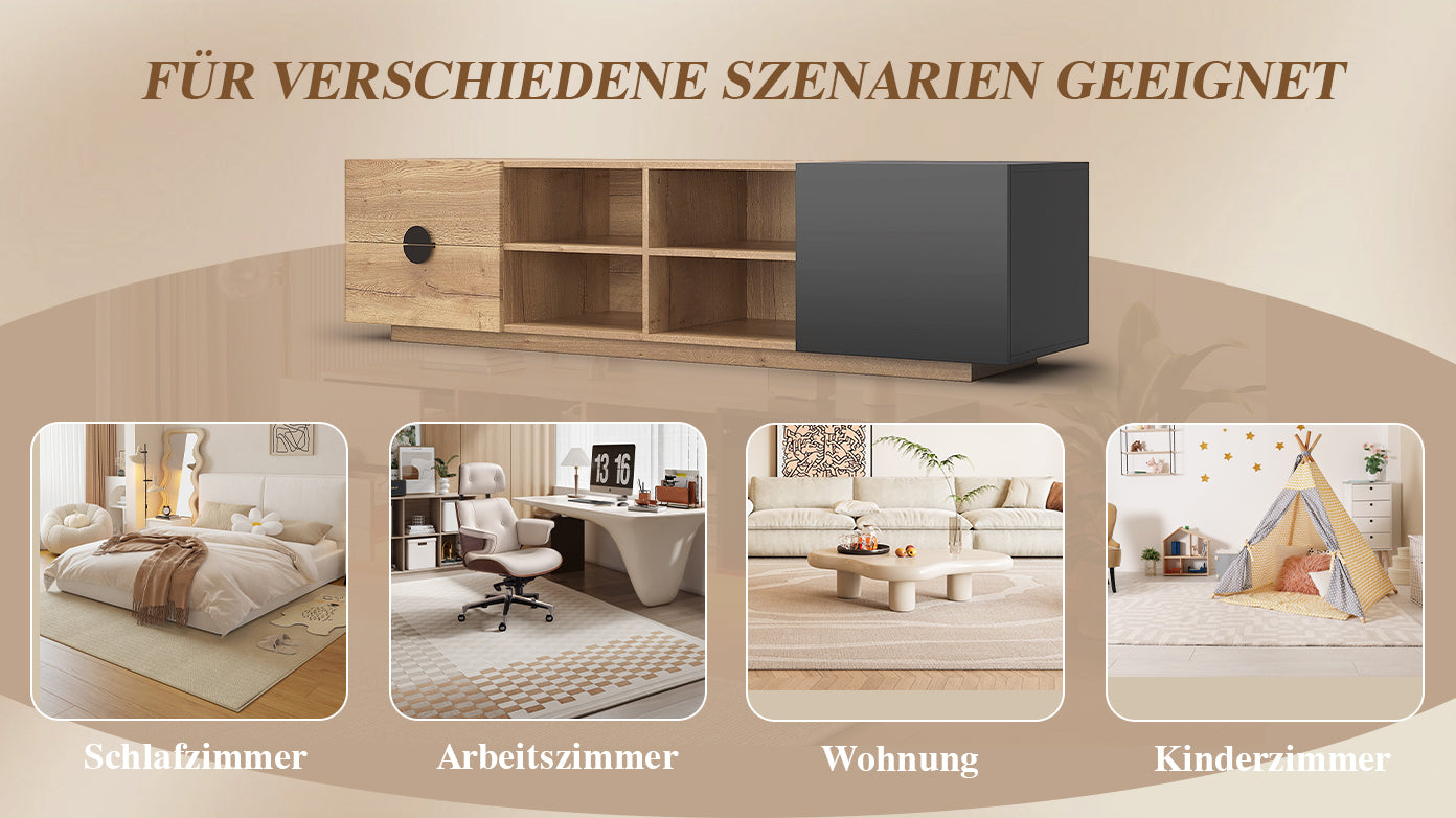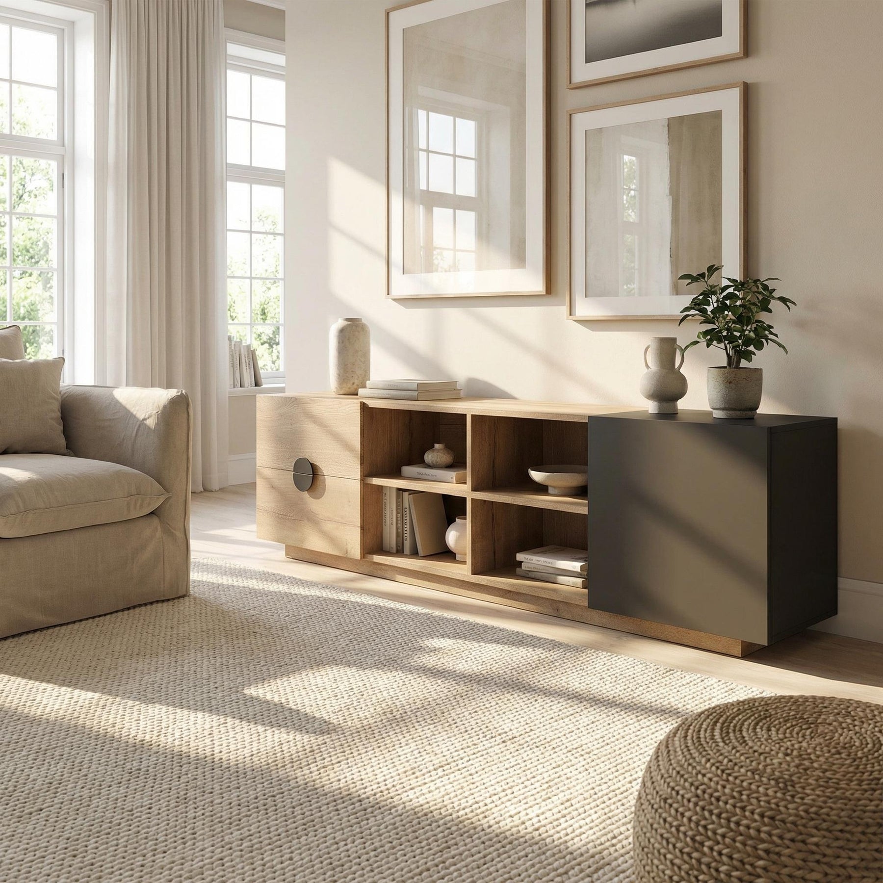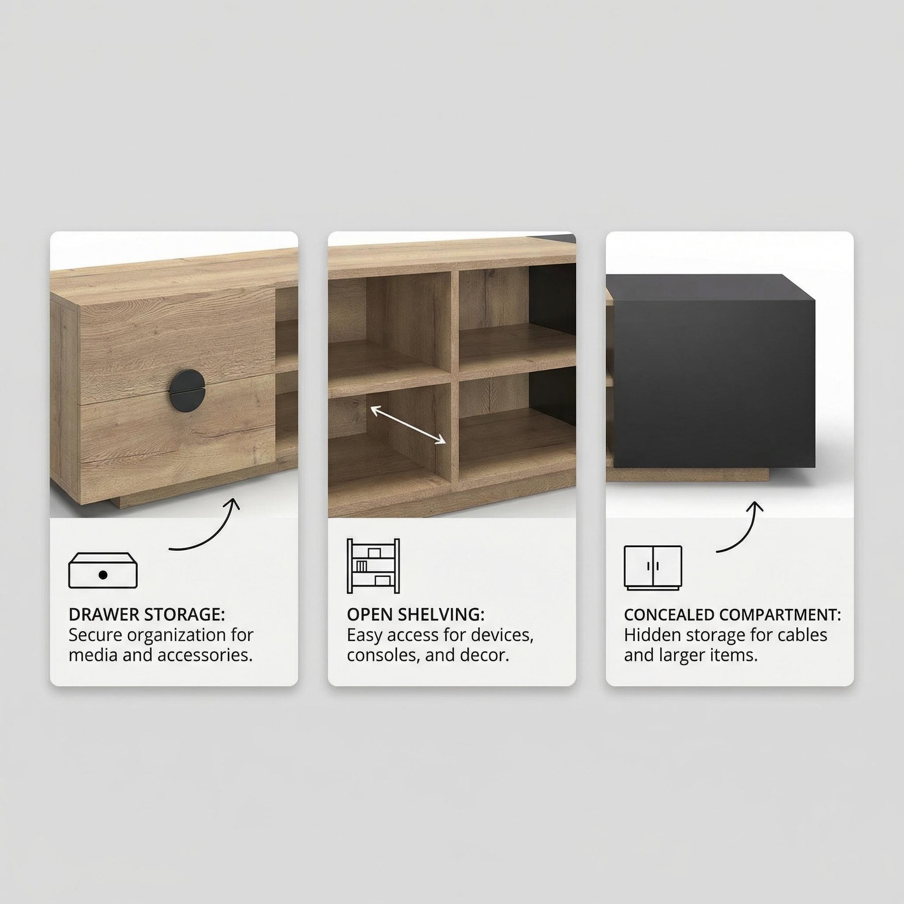 • Organisation optimale et accès facile : Grâce à ses étagères ouvertes, son tiroir à glissière silencieuse et son placard fermé, ce meuble TV offre un rangement structuré pour tous vos accessoires multimédias, livres, jouets ou objets déco. Fini le désordre, tout est à portée de main.