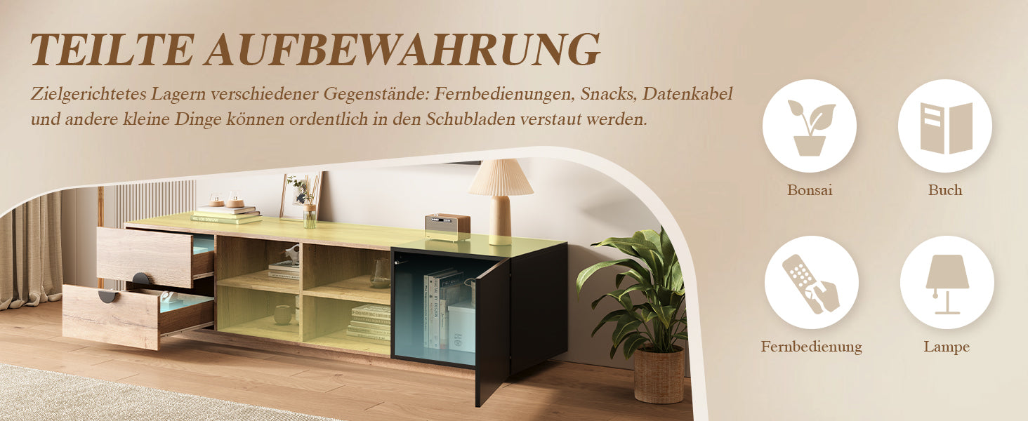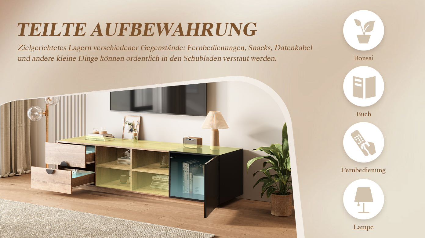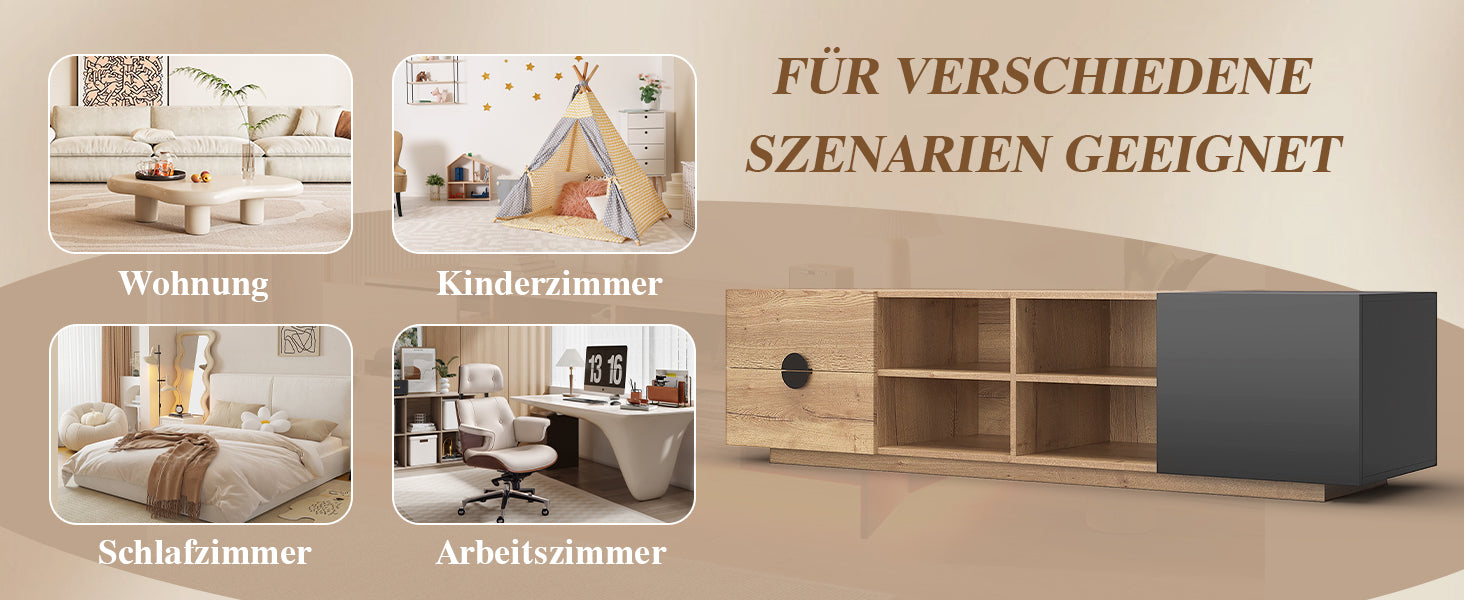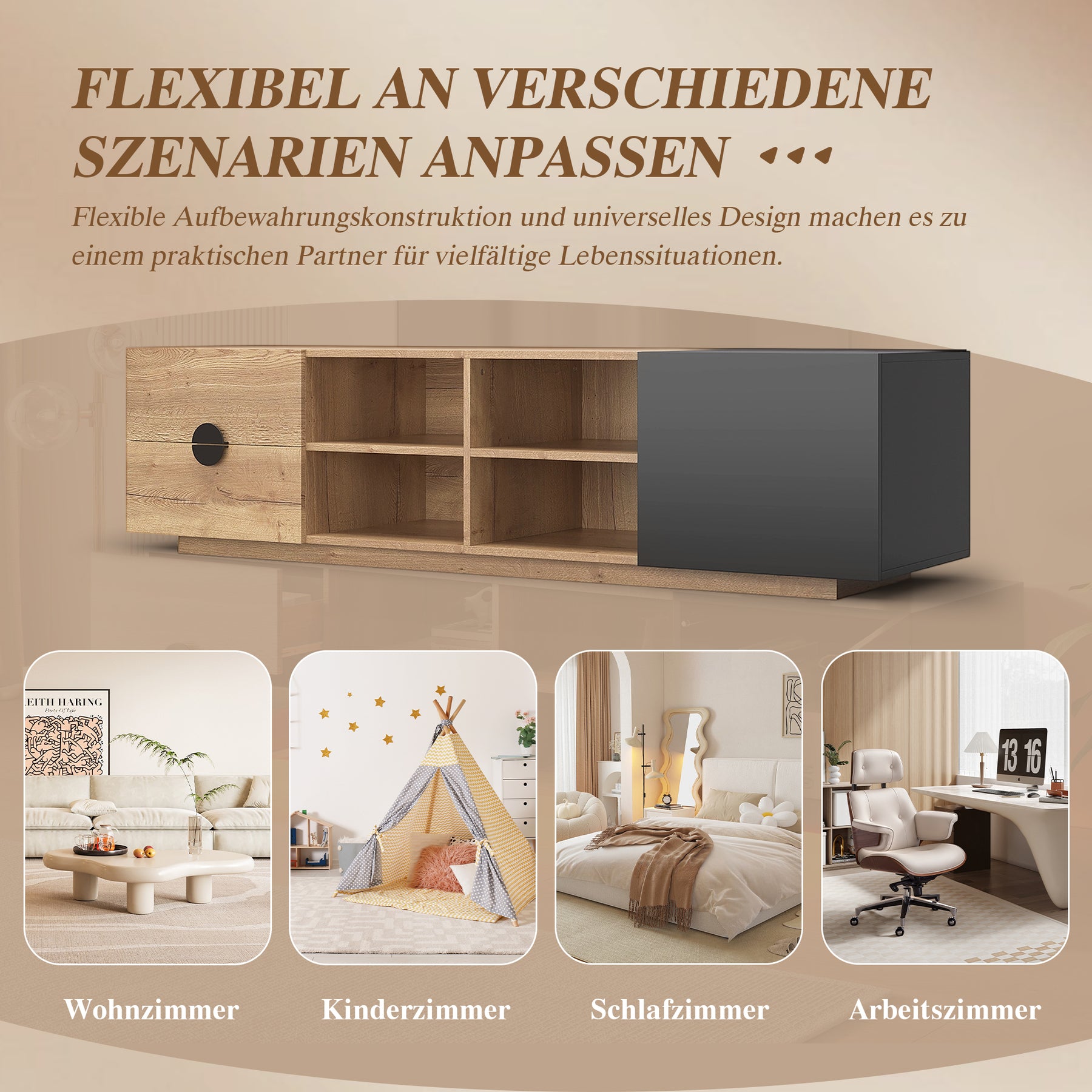 • Organisation optimale et accès facile : Grâce à ses étagères ouvertes, son tiroir à glissière silencieuse et son placard fermé, ce meuble TV offre un rangement structuré pour tous vos accessoires multimédias, livres, jouets ou objets déco. Fini le désordre, tout est à portée de main.