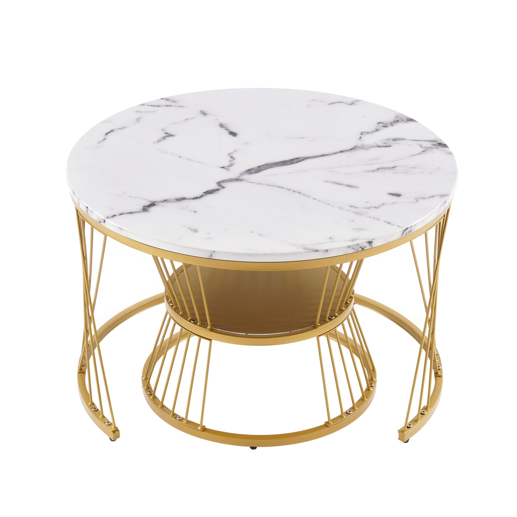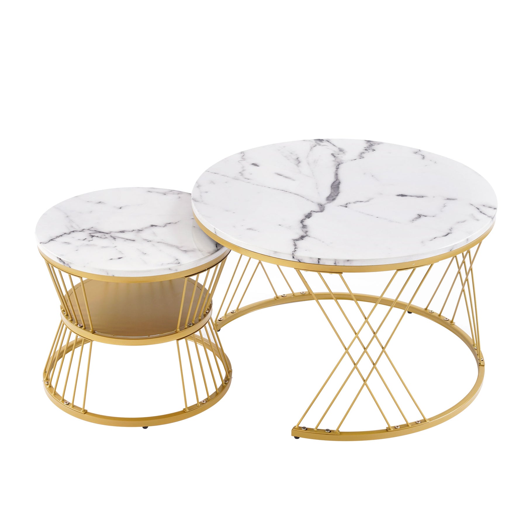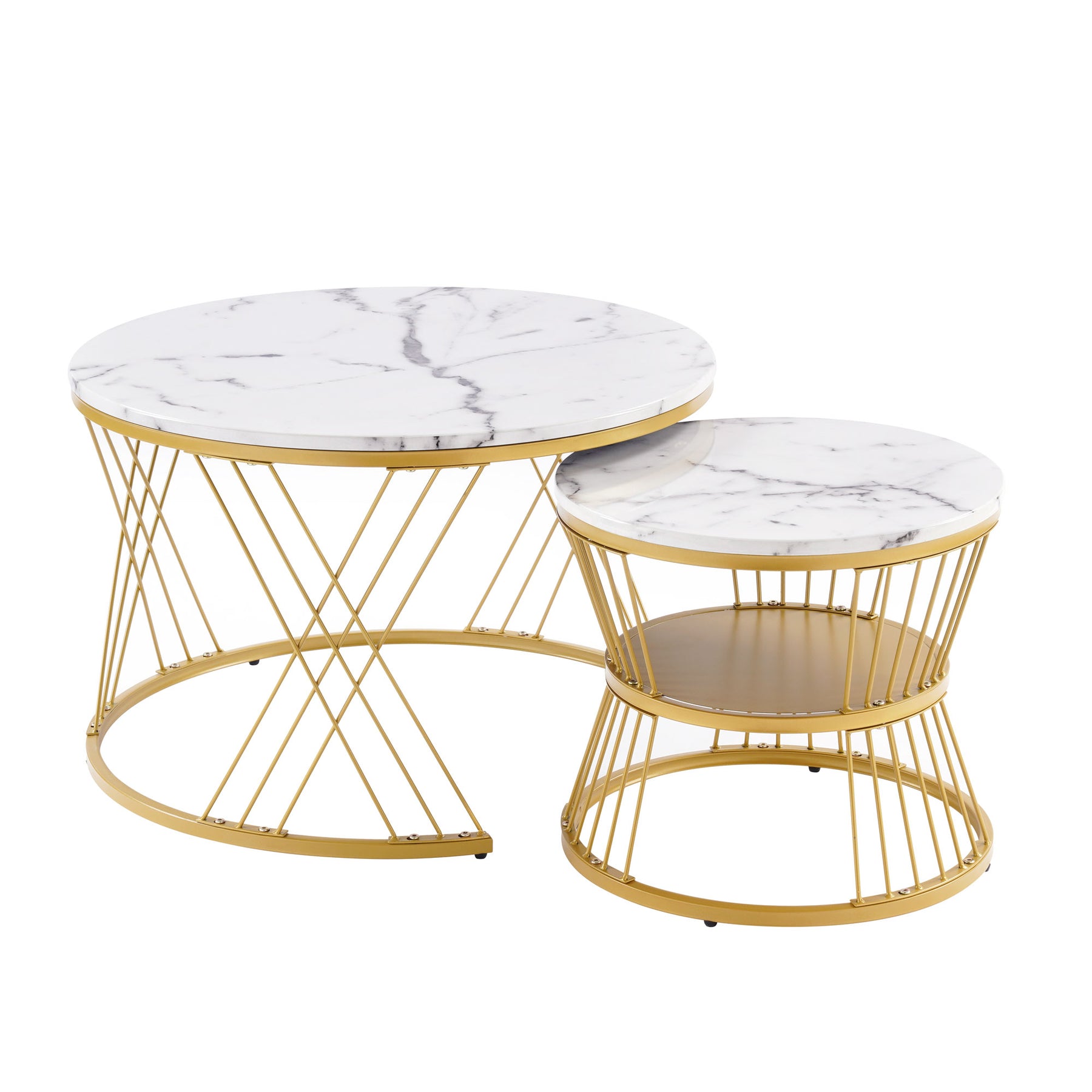 Ensemble de 2 tables basses rondes gigognes effet marbre blanc, piètement doré