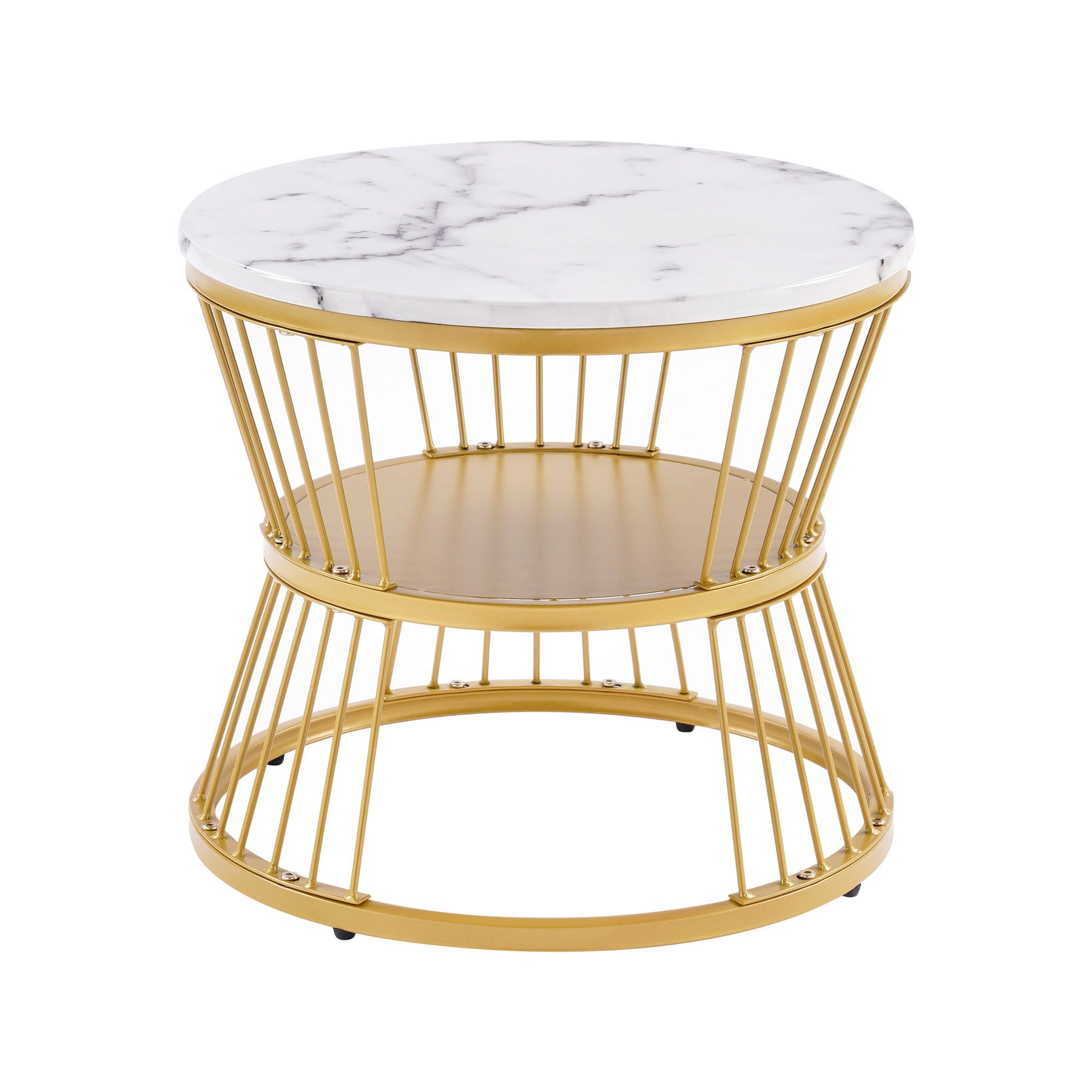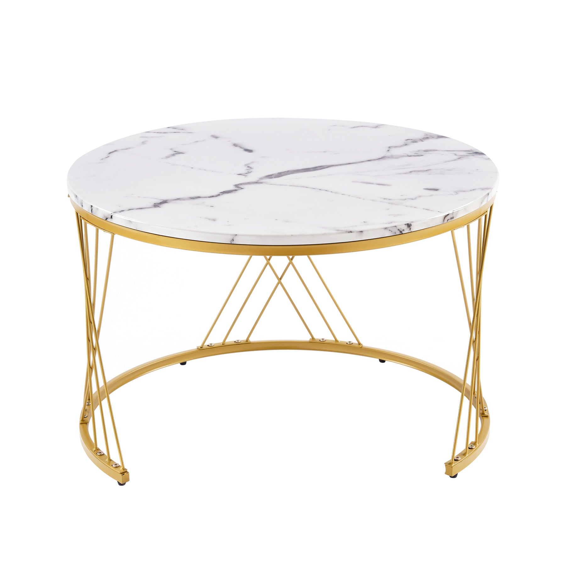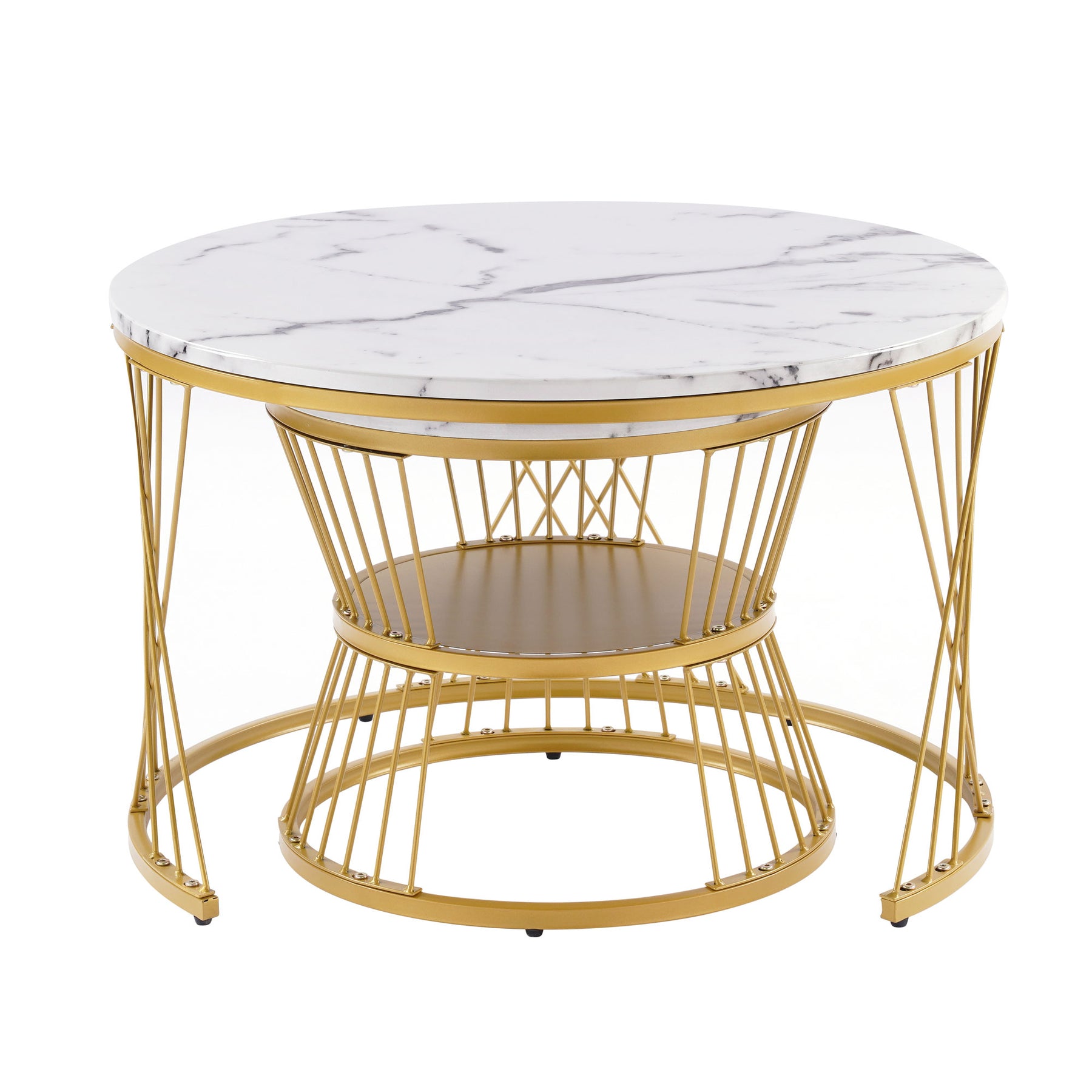 Ensemble de 2 tables basses rondes gigognes effet marbre blanc, piètement doré