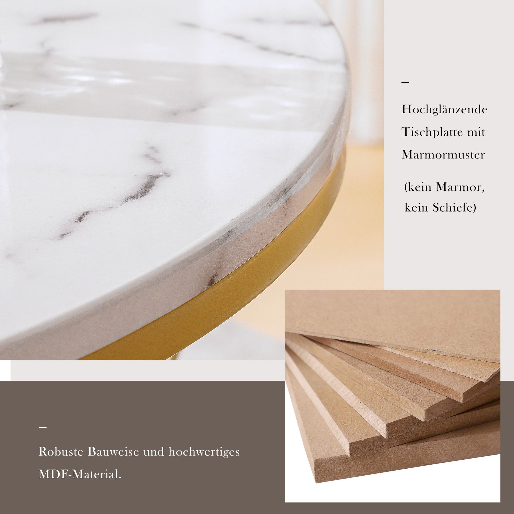 • Matériau : MDF avec finition effet marbre, piètement métal doré
