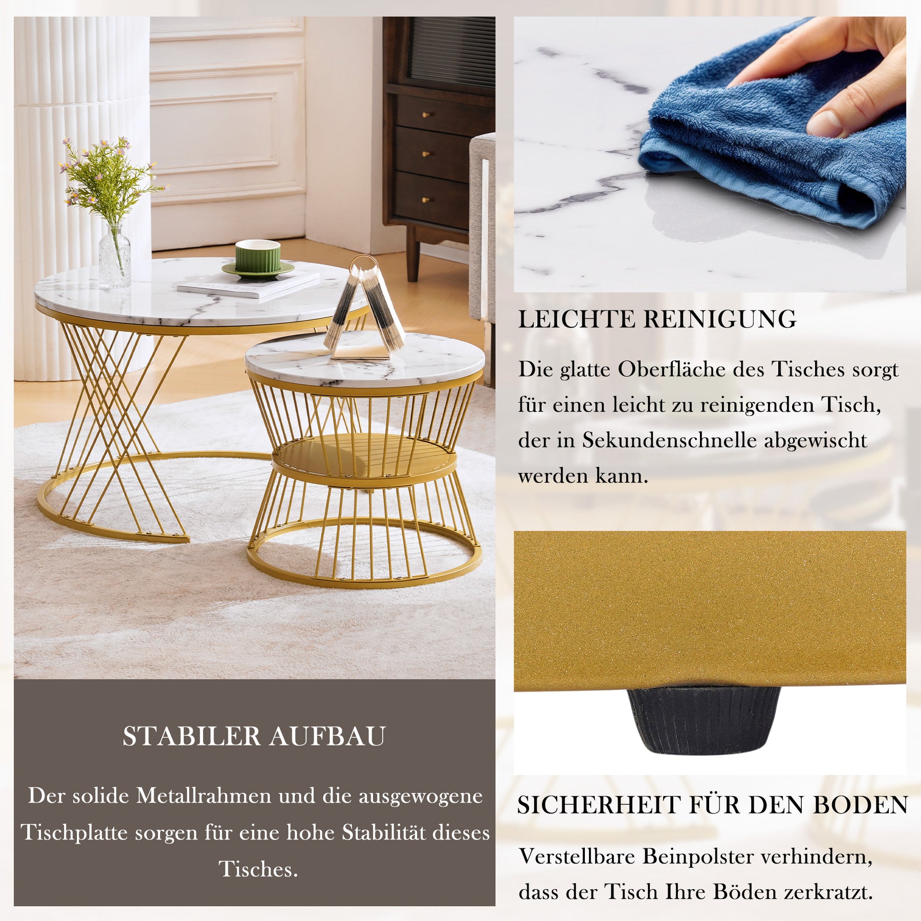 • Structure stable et sécurisée : Les pieds en métal doré assurent une excellente stabilité (charge jusqu’à 30 kg), et les patins antidérapants protègent votre sol des rayures et chocs.