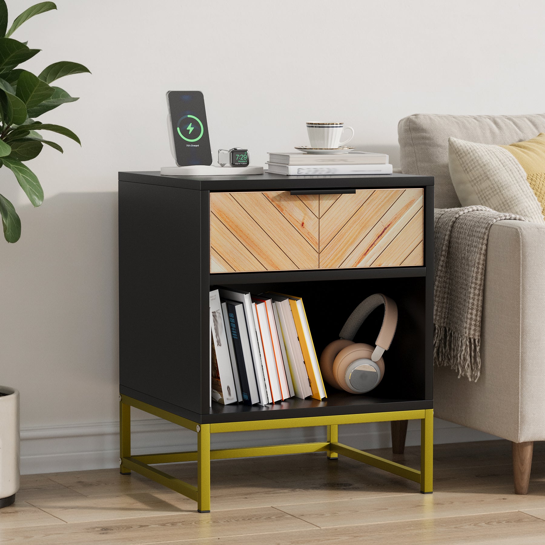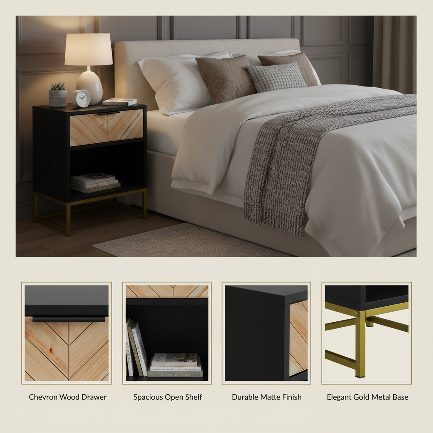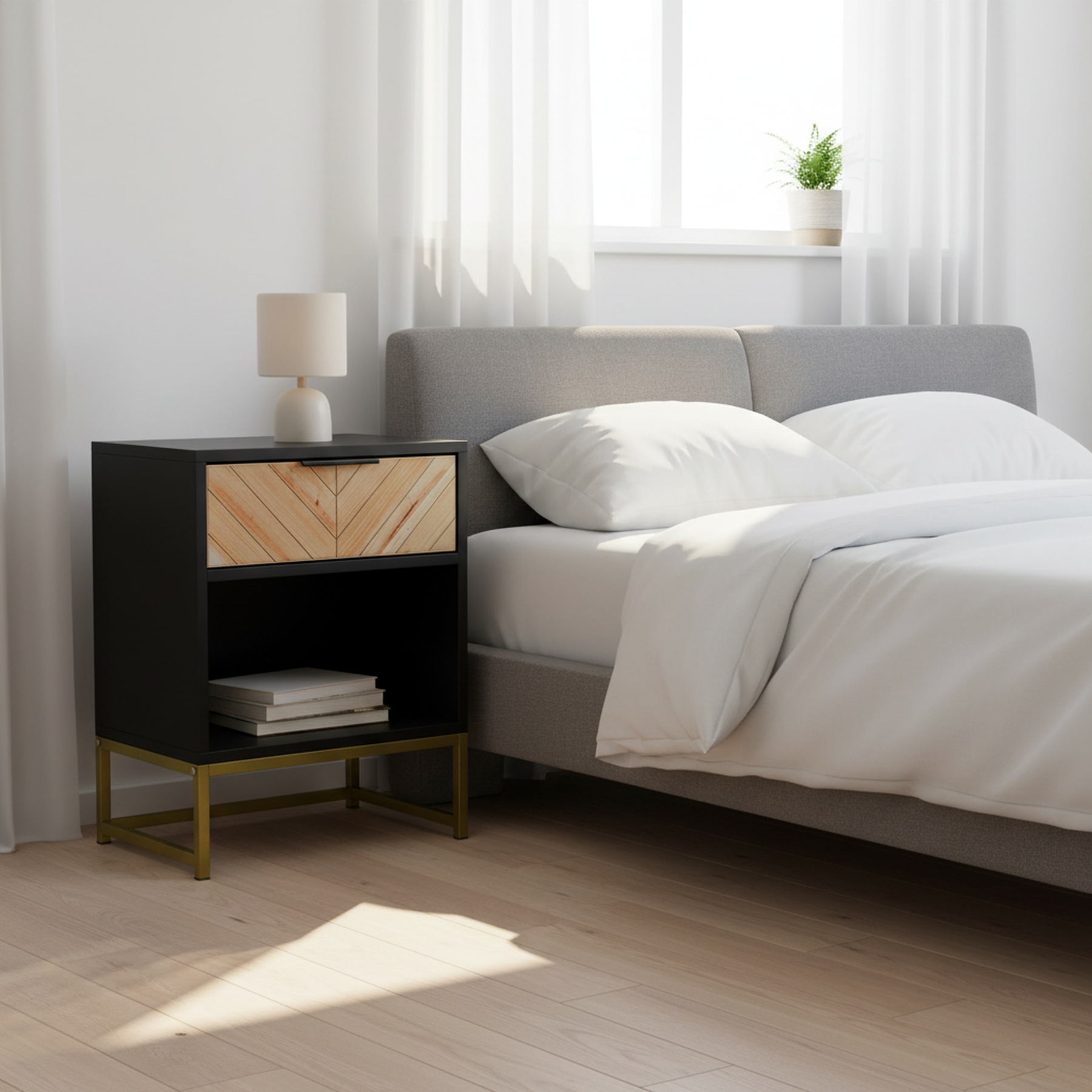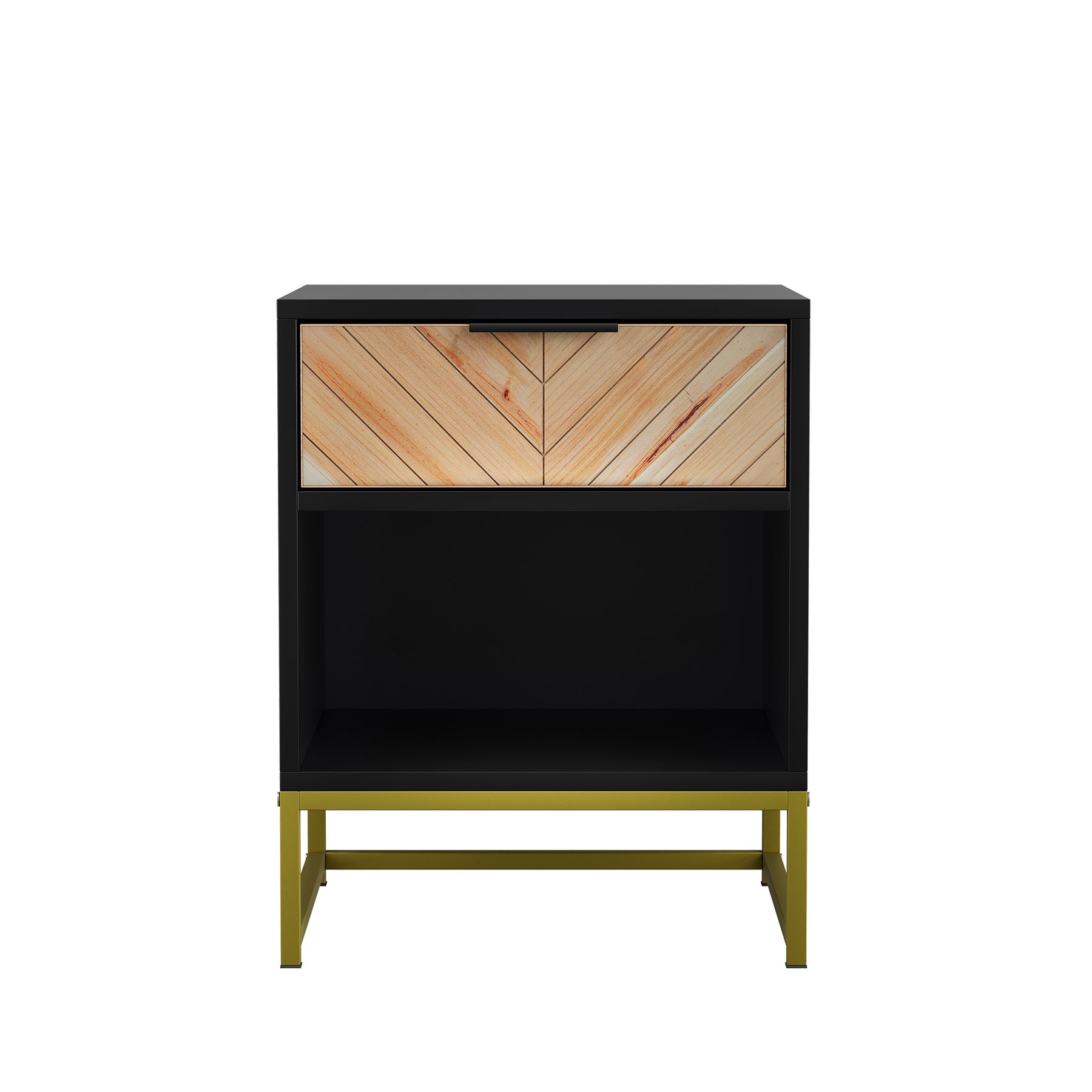 Table de chevet noir avec tiroir en bois à chevrons et pieds métalliques dorés FOCUSE