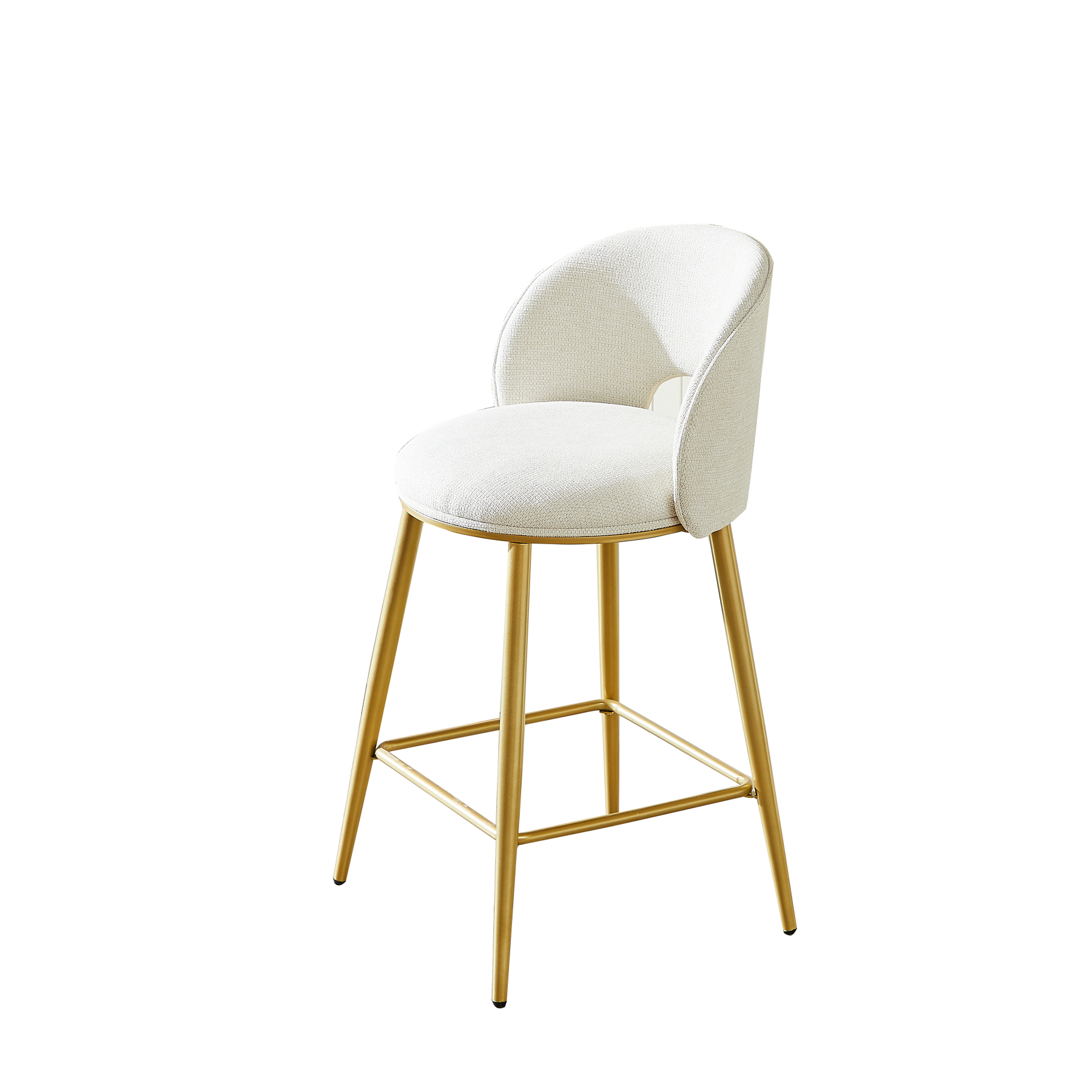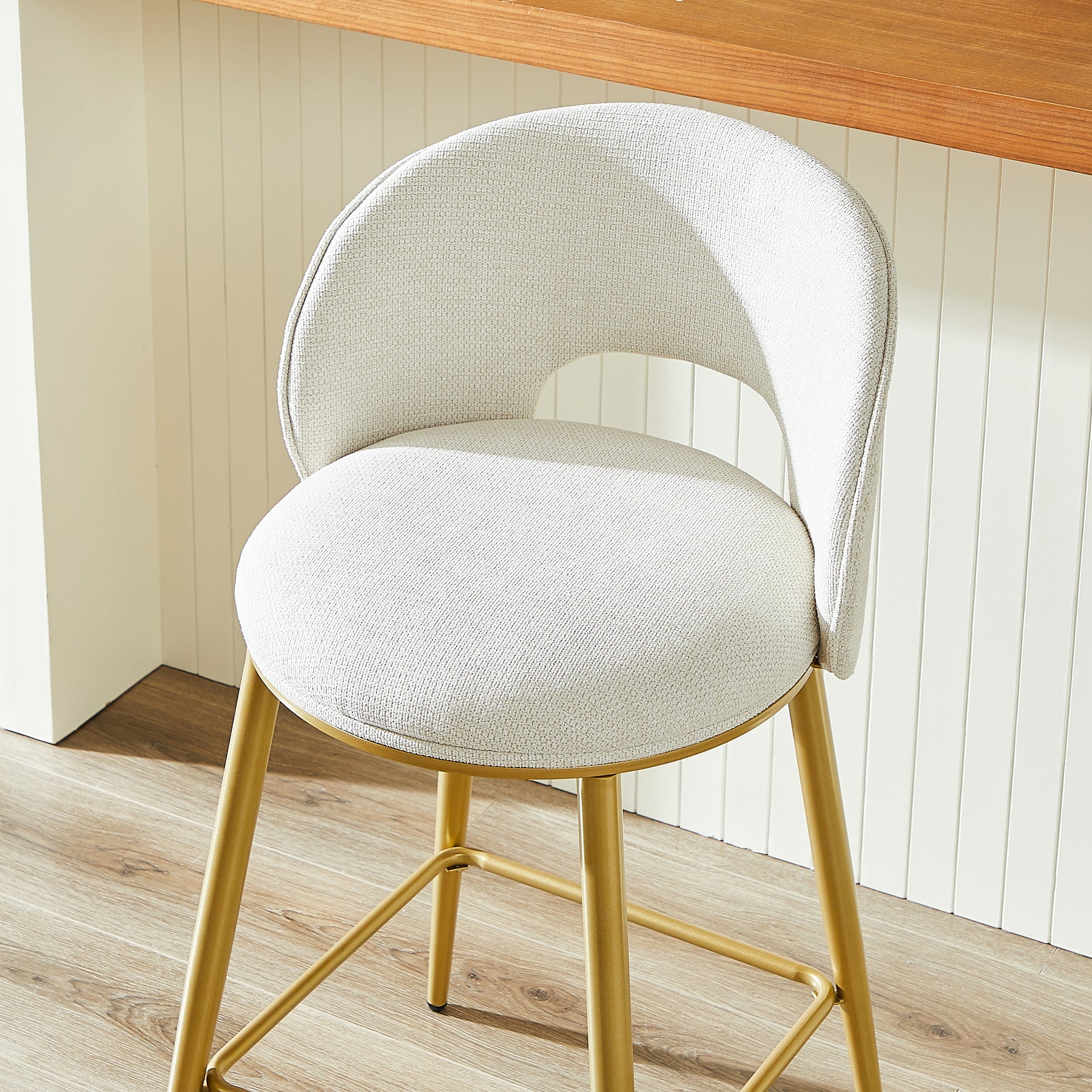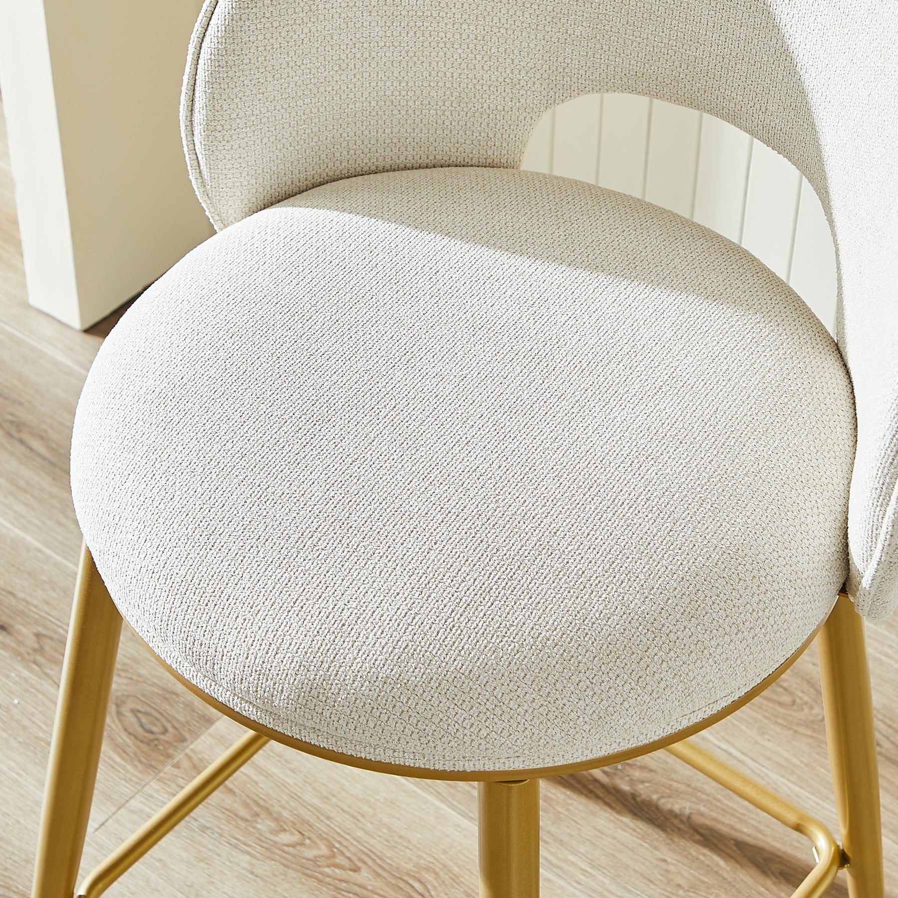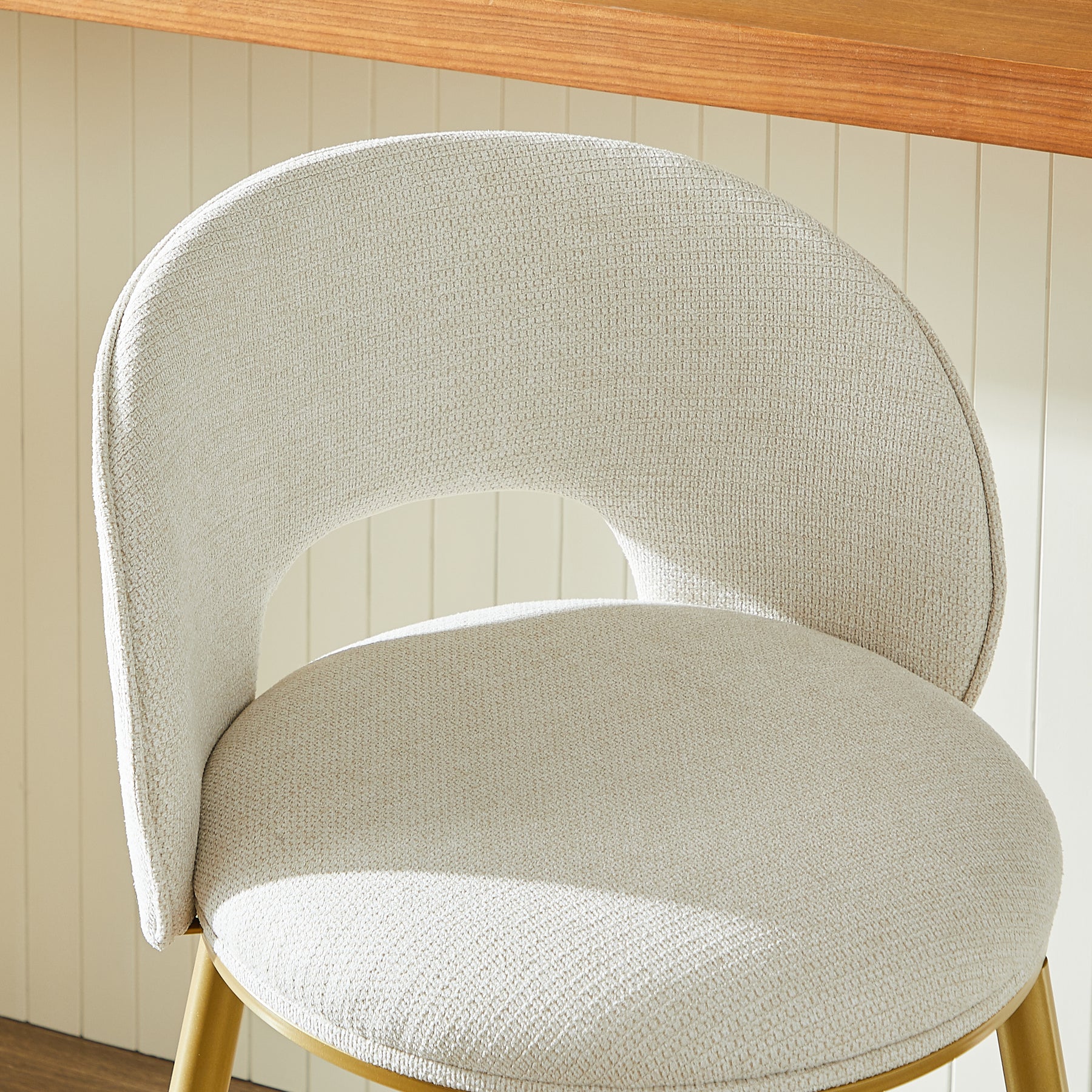 Lot de 2 tabourets de bar chenille beige avec dossier ajouré, pieds dorés FLAREKAEL