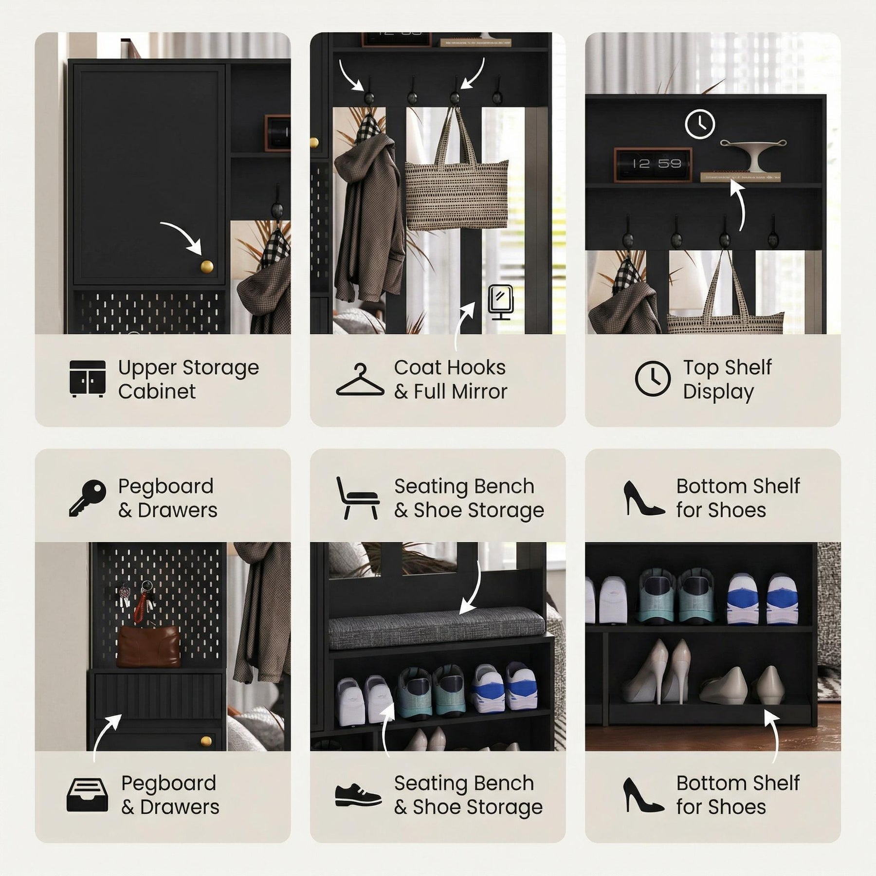 Rangement Intelligent et Varié : Offre plusieurs compartiments fermés et étagères ouvertes pour garder vos vestes et chaussures parfaitement ordonnées.