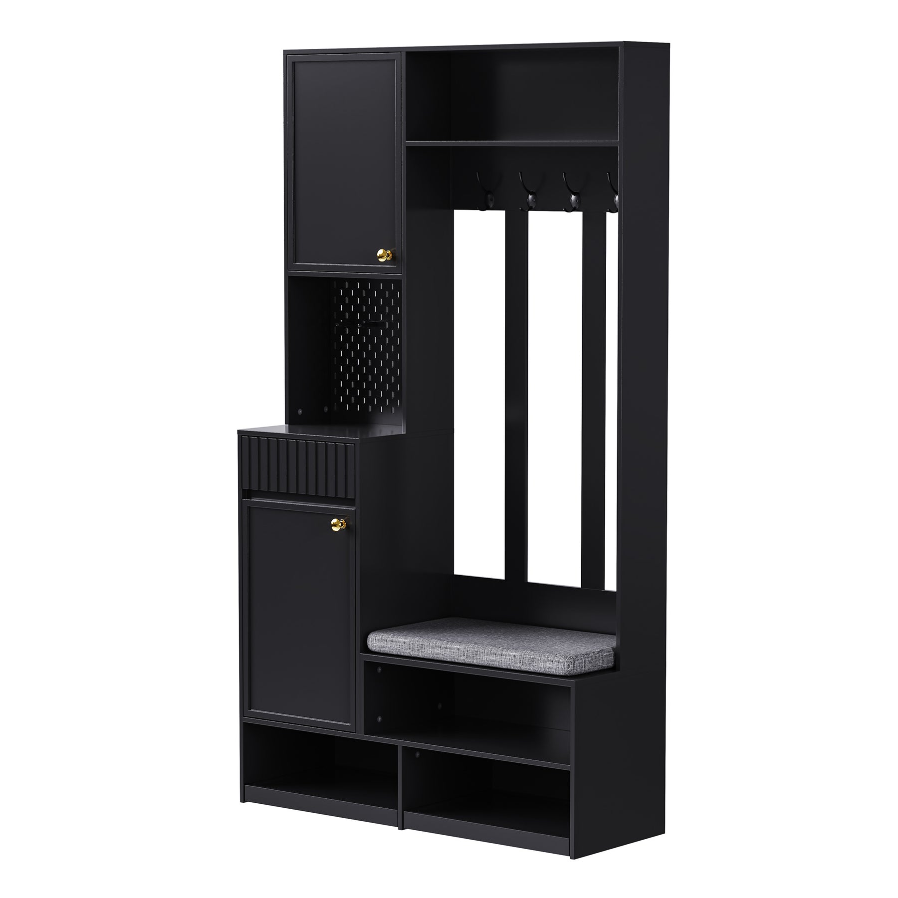 Assise Confortable Intégrée : Comprend un banc avec coussin moelleux gris, idéal pour se chausser et se déchausser confortablement.