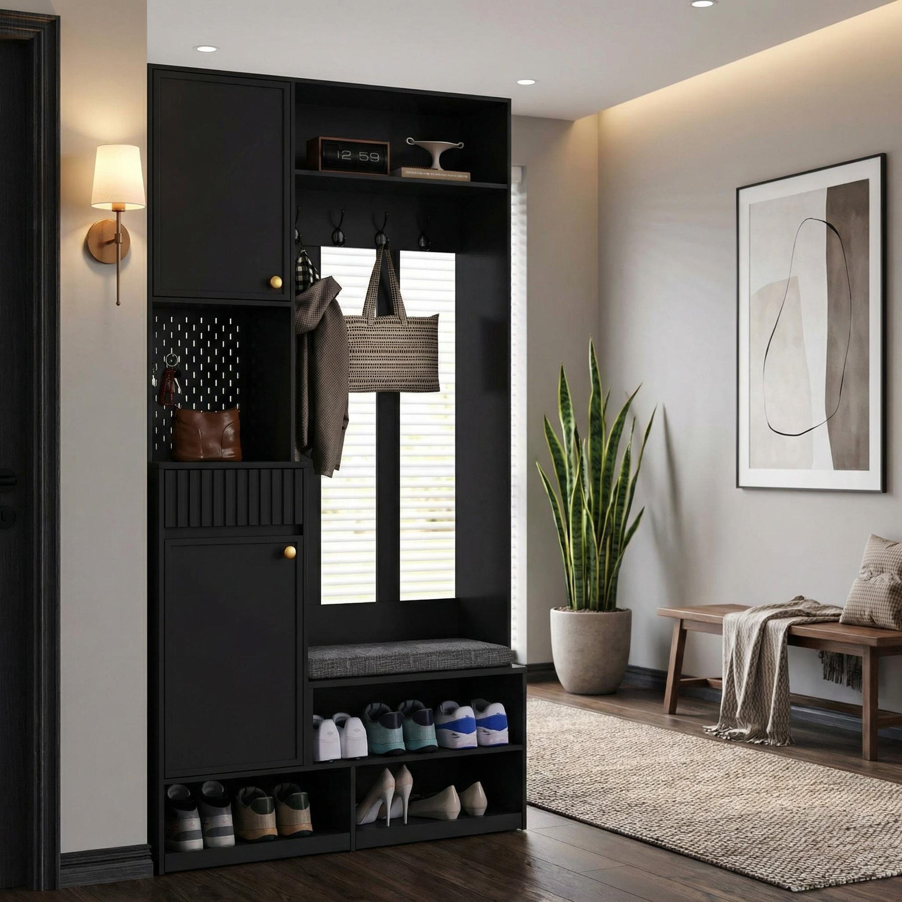 Vestiaire à l'entrée noir multifonction avec banc et rangements 100×180×35 cm BLISSUM