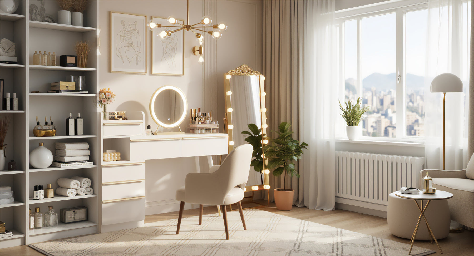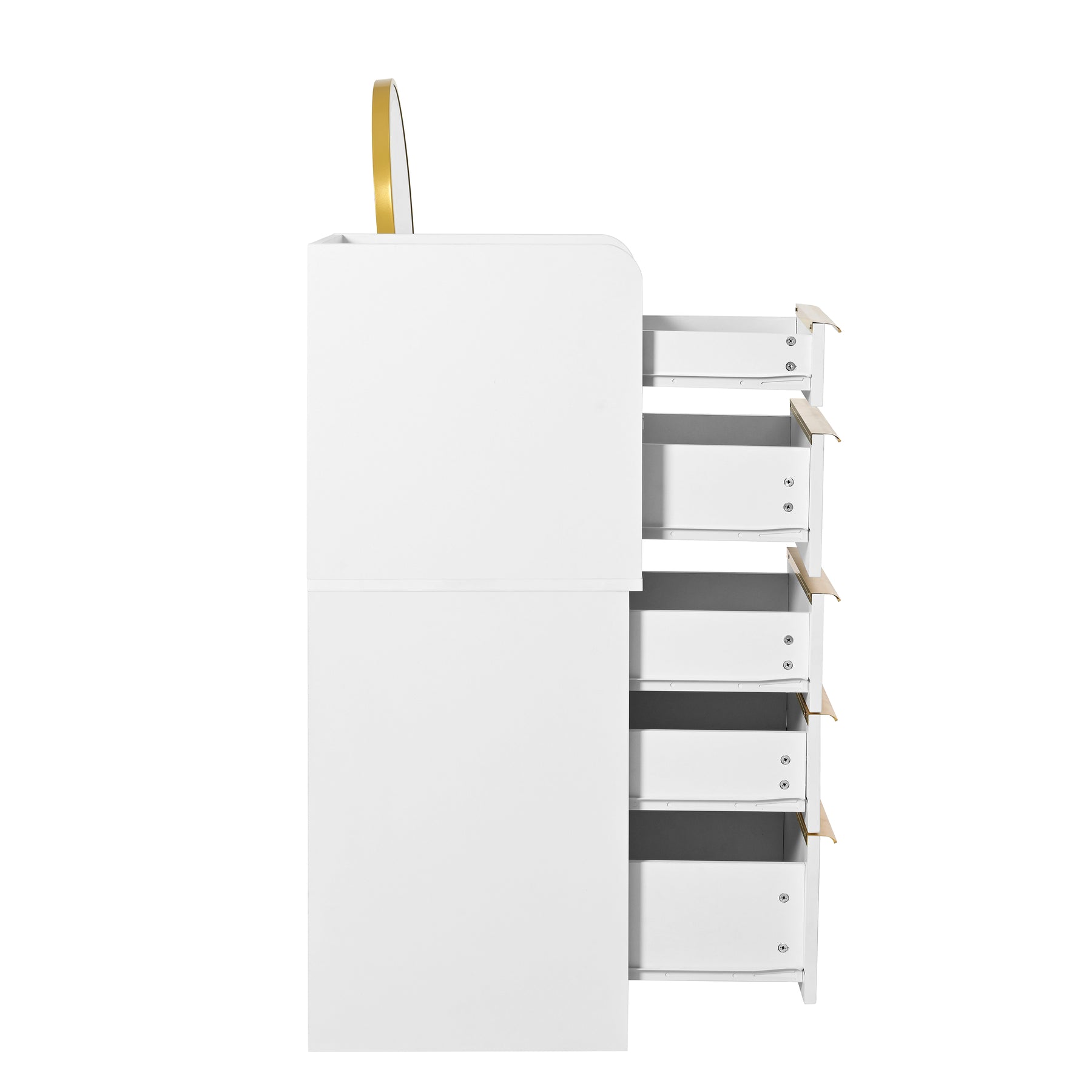 • Grand espace de rangement : Six tiroirs spacieux avec de belles poignées dorées offrent un espace généreux pour organiser vos cosmétiques, bijoux et accessoires.