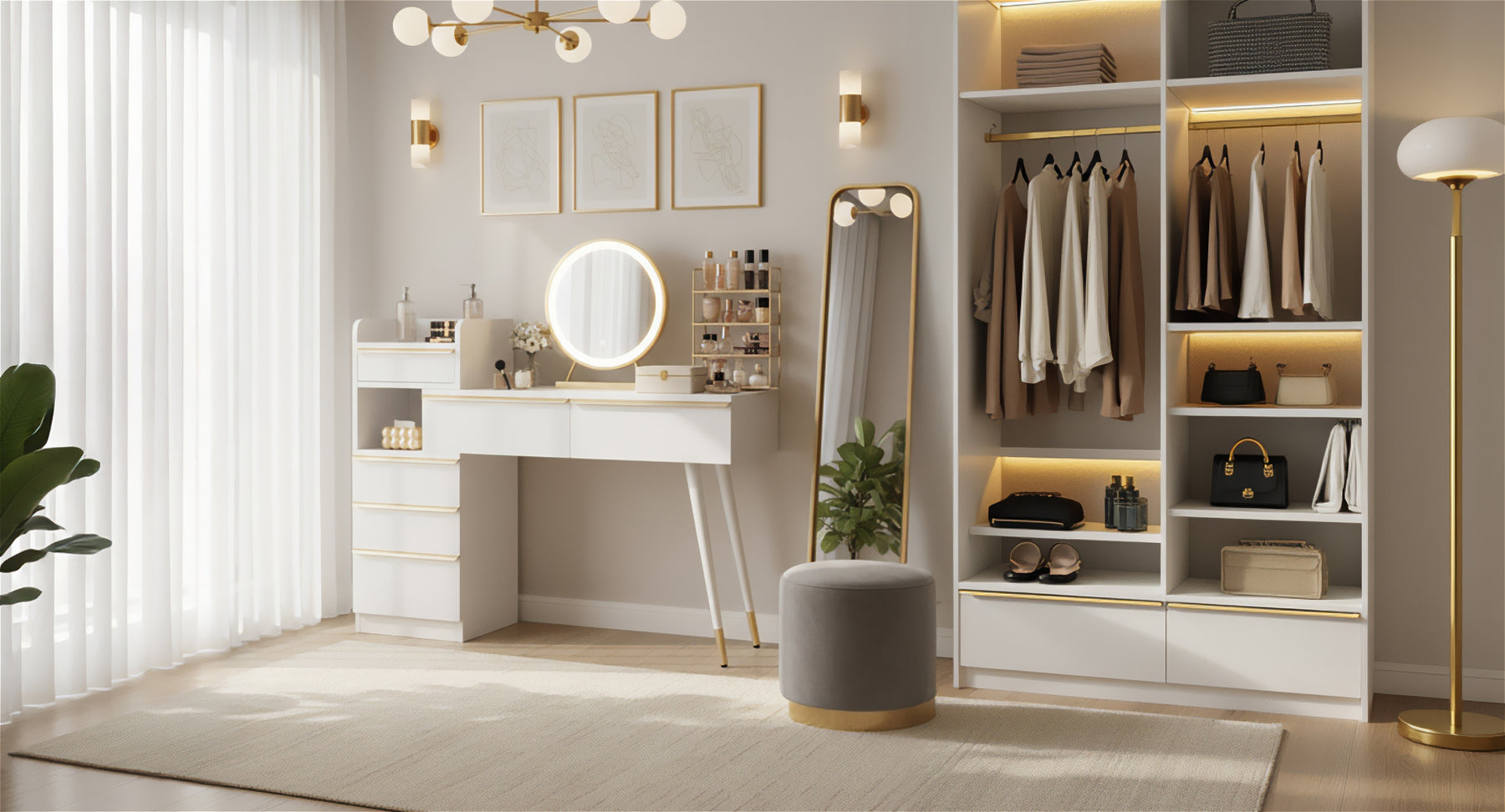 • Design moderne et élégant : La finition blanche épurée, les poignées dorées et les pieds en bois massif confèrent à ce meuble un look à la fois chic et contemporain.