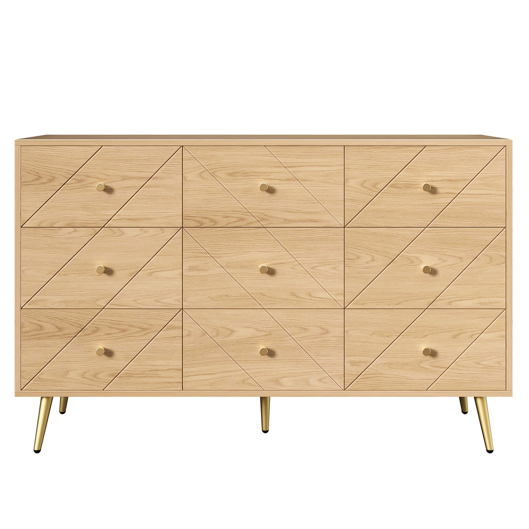 Ajoutez une touche de modernité et de fonctionnalité à votre intérieur avec cette commode élégante. Dotée de neuf tiroirs spacieux, elle offre une solution de rangement exceptionnelle pour vos vêtements, accessoires ou autres objets ménagers. Le design se distingue par des motifs géométriques sur les façades des tiroirs et des pieds en fer raffinés qui confèrent à l'ensemble un look minimaliste et contemporain. Parfaite pour le salon, la chambre ou le couloir, cette commode allie style et polyvalence pour s'intégrer harmonieusement à n'importe quel décor.