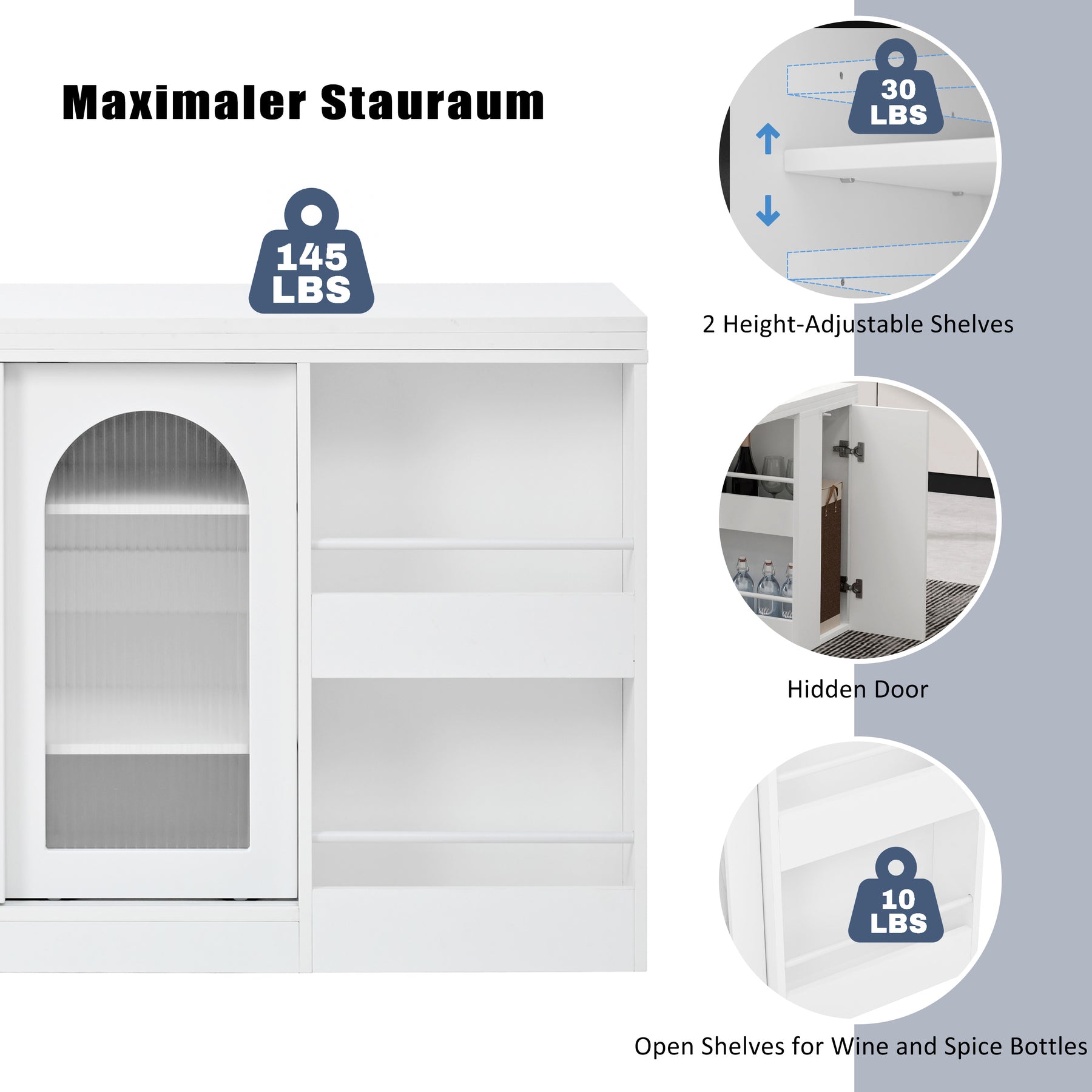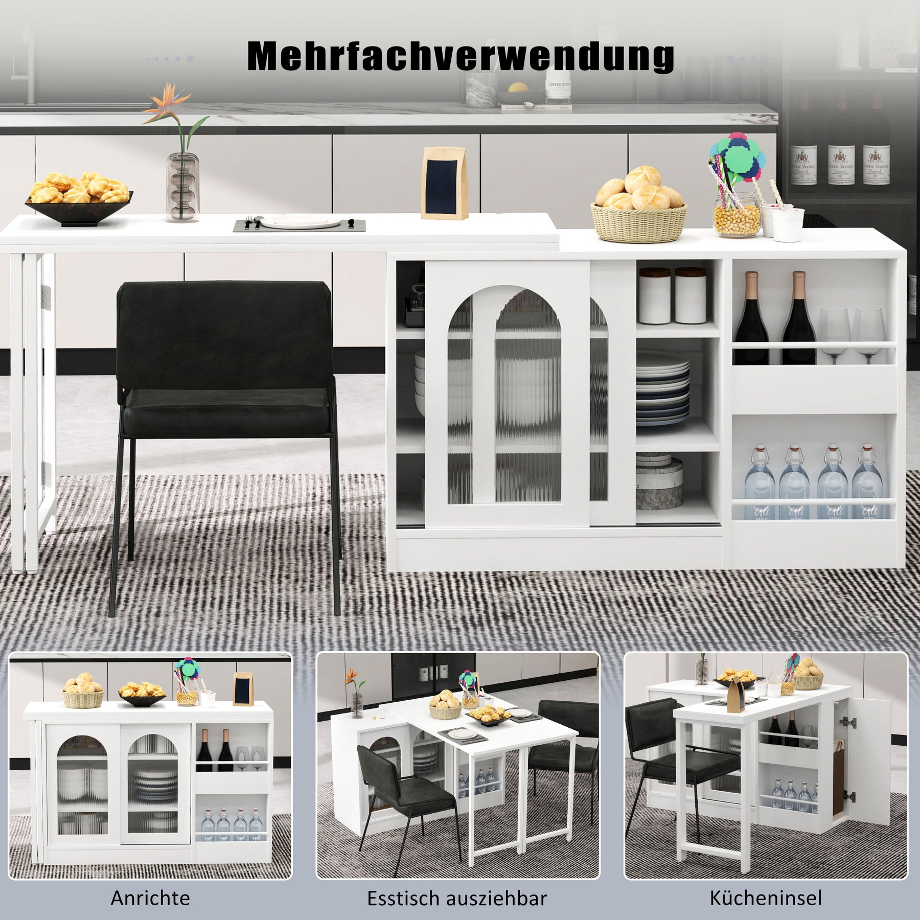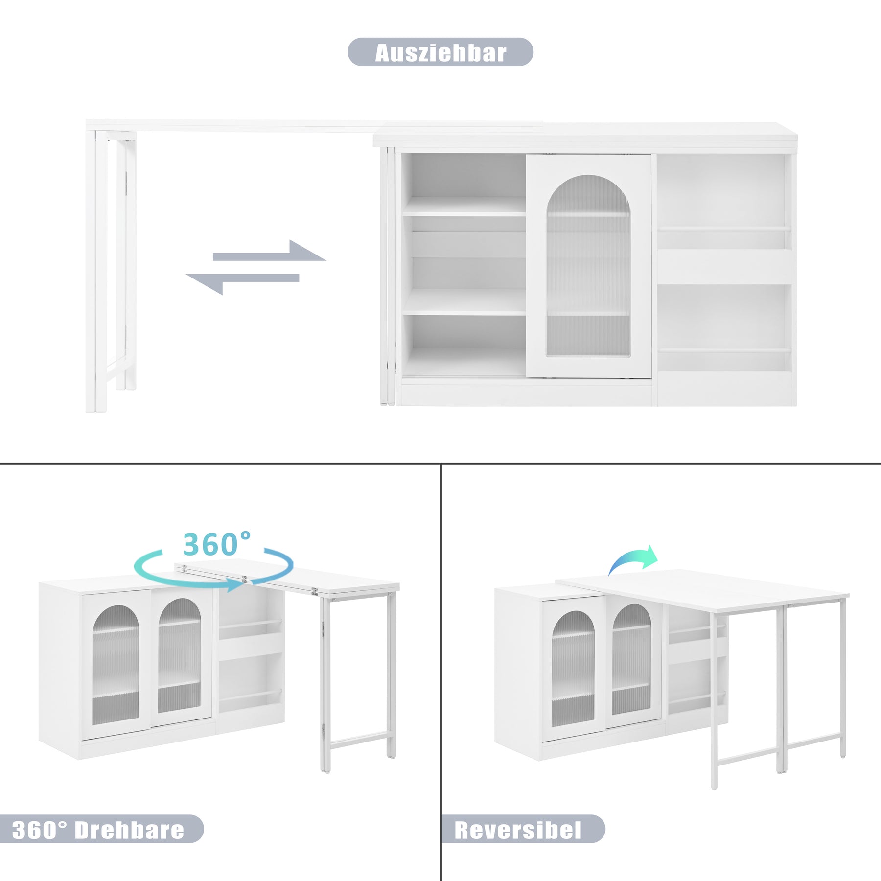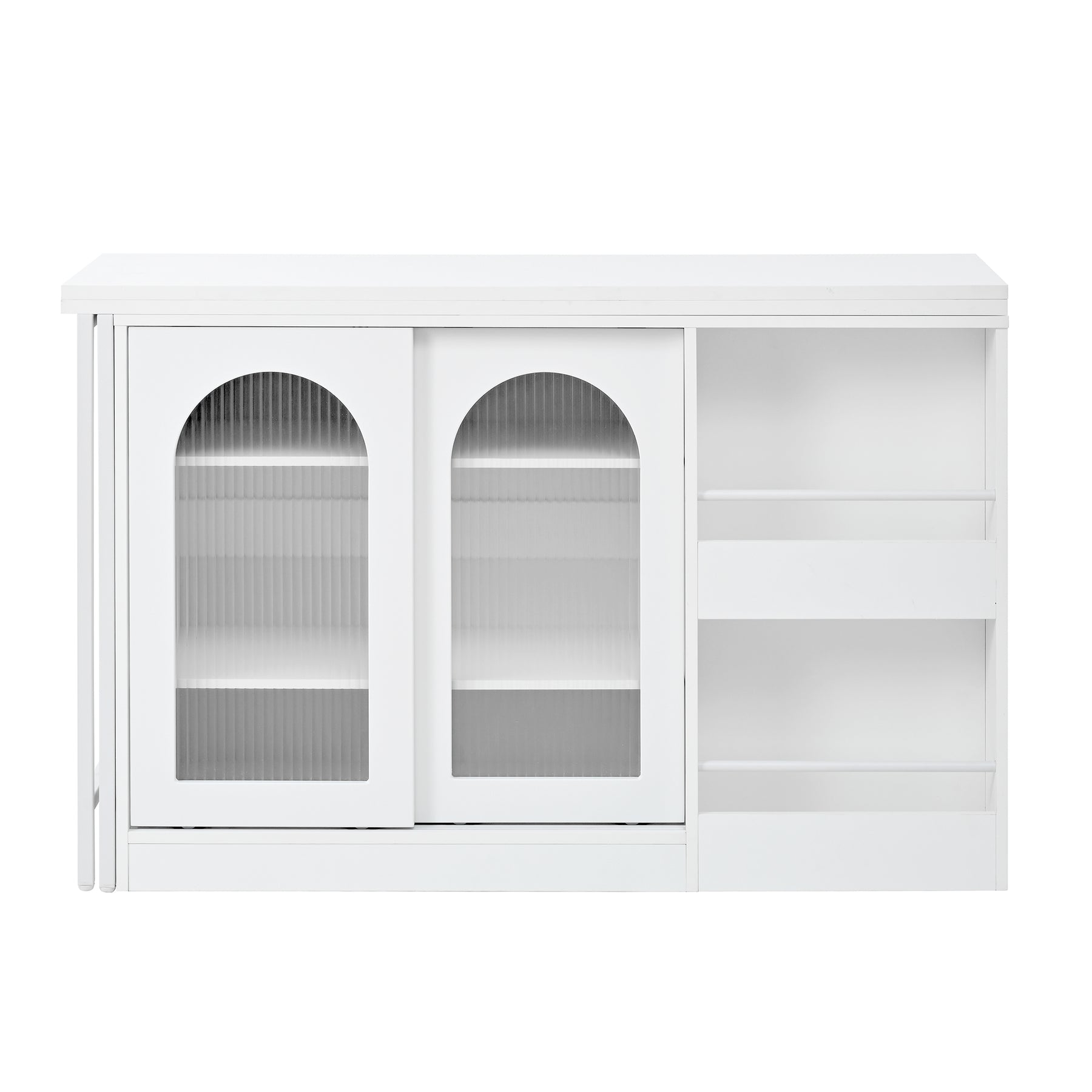 Buffet avec table retratable à 360° avec portes en verre ondulé convertible îlot de cuisine blanc PRAIRIEHAZE